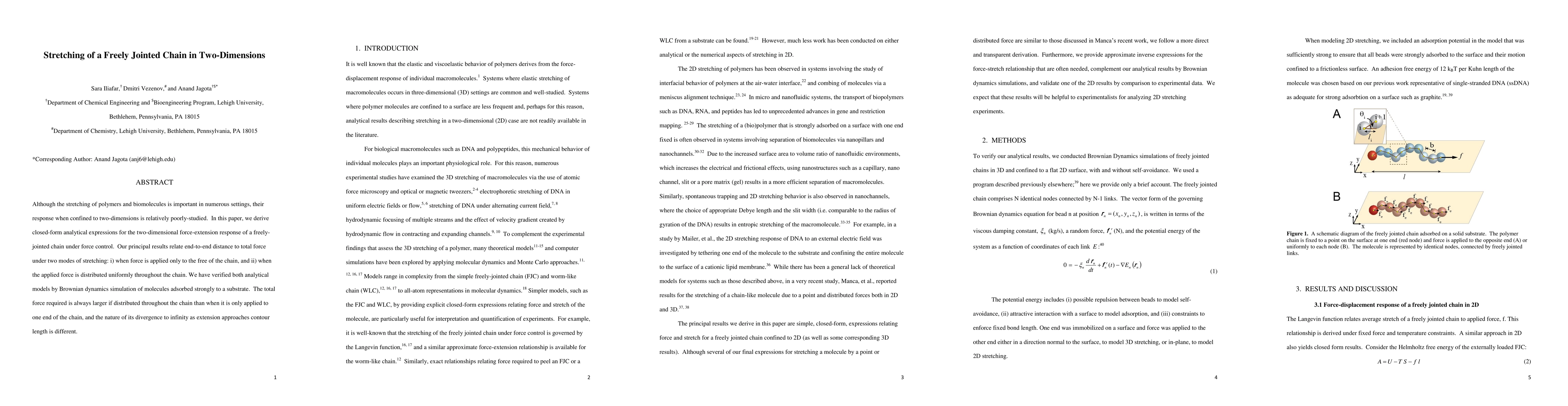 This paper presents analytical models and simulations for the stretching behavior of a freely-jointed chain confined to two dimensions. Key findings reveal that a uniformly distributed force across the chain requires more total force and diverges differently as extension nears contour length compared to force applied only to one end.
