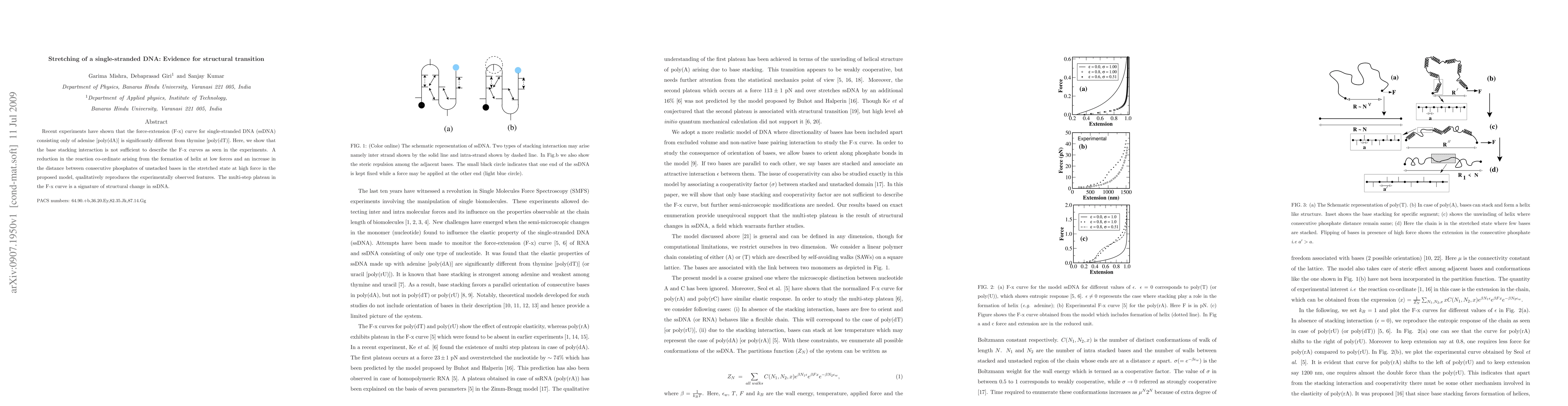 This study reveals that the force-extension curve for poly(dA) ssDNA differs from poly(dT), indicating structural transitions beyond base stacking. The proposed model accounts for helix formation at low forces and increased phosphate distance at high forces, explaining the multi-step plateau in the F-x curve as evidence of ssDNA structural change.