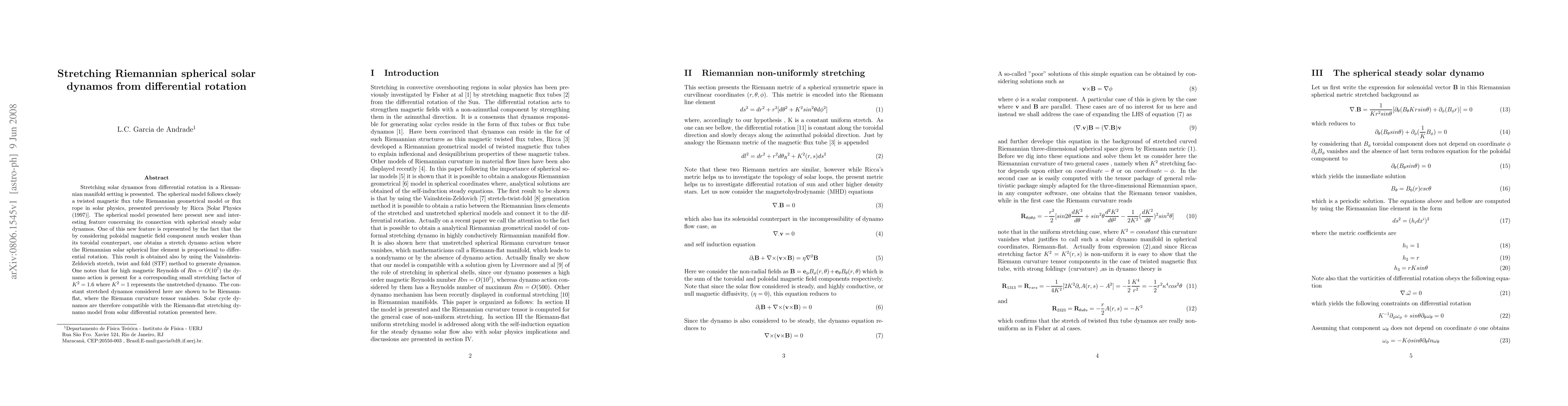 Stretching solar dynamos from differential rotation in a Riemannian manifold setting is presented. The spherical model follows closely a twisted magnetic flux tube Riemannian geometrical model or flux rope in solar physics, presented previously by Ricca [Solar Physics (1997)]. The spherical model presented here present new and interesting feature concerning its connection with spherical steady solar dynamos. One of this new feature is represented by the fact that the by considering poloidal magnetic field component much weaker than its toroidal counterpart, one obtains a stretch dynamo action where the Riemannian solar spherical line element is proportional to differential rotation. This result is obtained also by using the Vainshtein-Zeldovich stretch, twist and fold (STF) method to generate dynamos. One notes that for high magnetic Reynolds of $R{m}=O({10^{7}})$ the dynamo action is present for a corresponding small stretching factor of $K^{2}=1.6$ where $K^{2}=1$ represents the unstretched dynamo. The constant stretched dynamos considered here are shown to be Riemann-flat, where the Riemann curvature tensor vanishes. Solar cycle dynamos are therefore compatible with the Riemann-flat stretching dynamo model from solar differential rotation presented here.