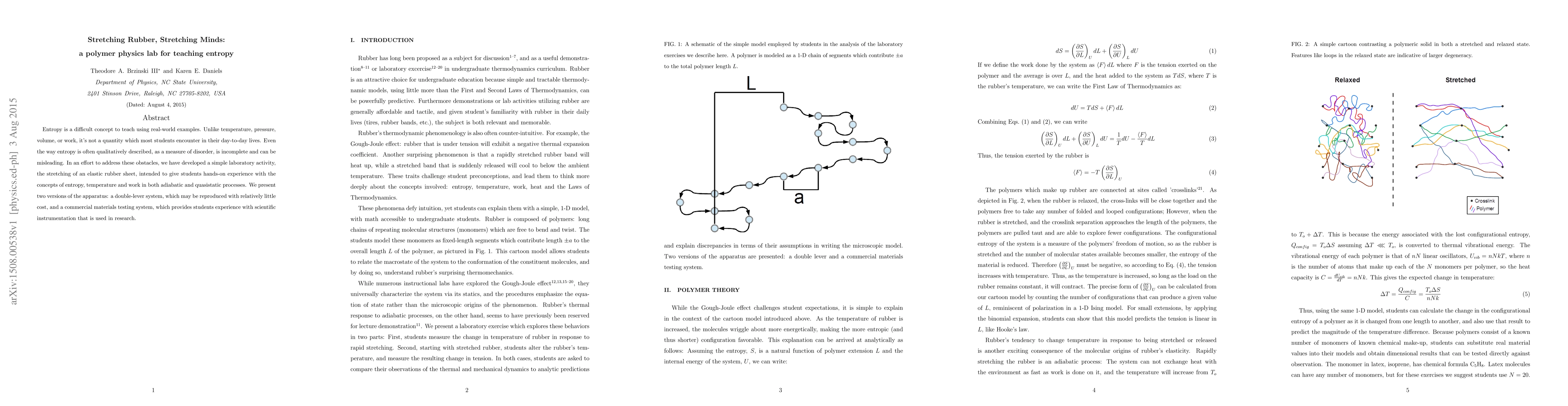 A laboratory activity involving stretching rubber helps students understand entropy, temperature, and work through hands-on experiments. Two versions of the apparatus are presented to cater to different budgets and levels of scientific instrumentation.