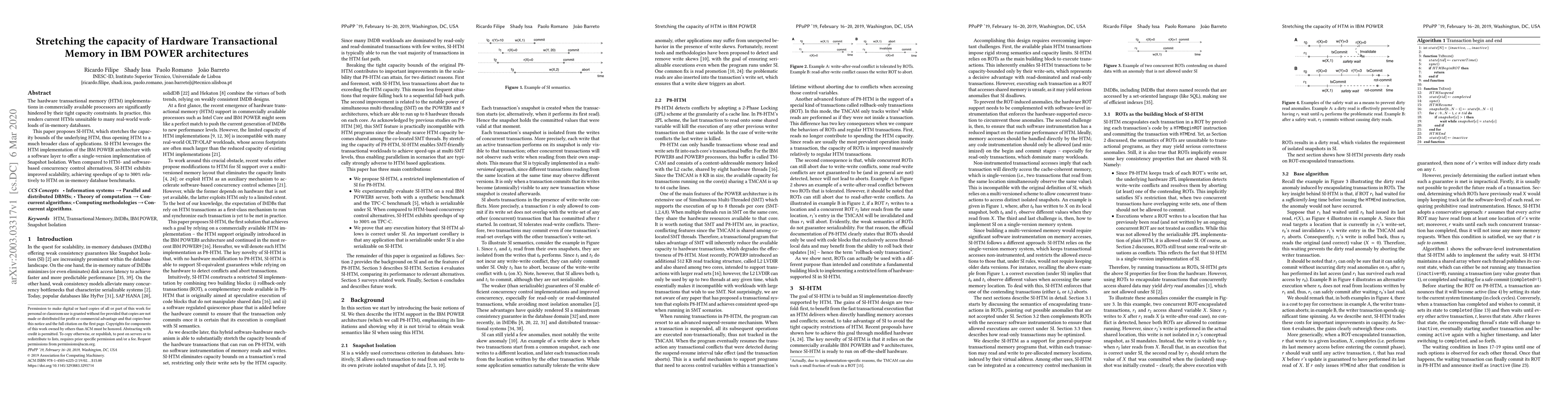 This paper proposes SI-HTM to enhance the capacity of hardware transactional memory (HTM) in IBM POWER architectures, enabling broader application use. SI-HTM combines HTM with a software layer for Snapshot Isolation, demonstrating up to 300% speedups over HTM alone in in-memory database benchmarks.