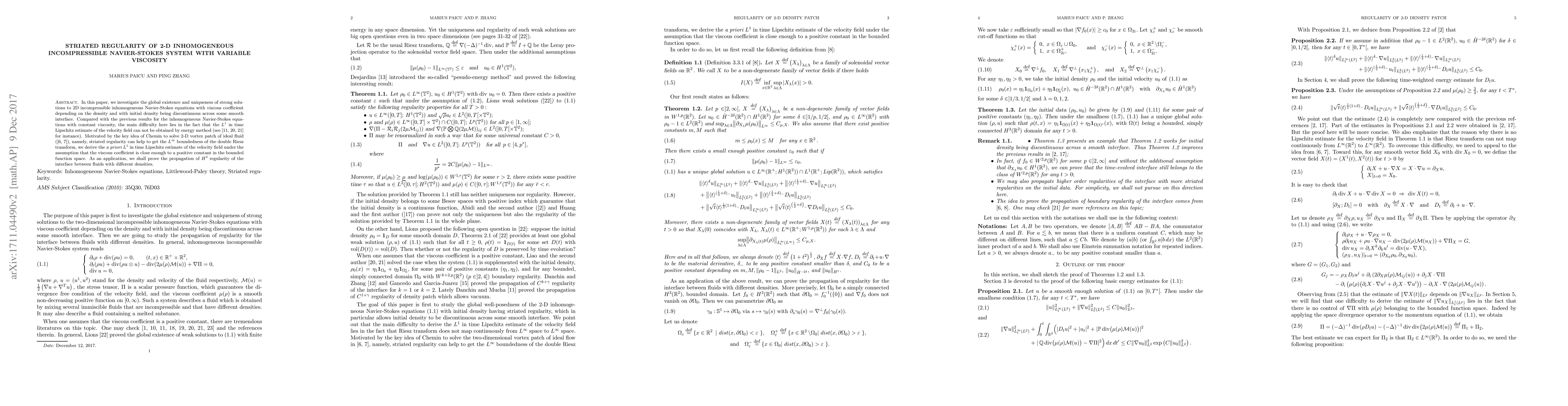 This paper explores the global existence and uniqueness of strong solutions for 2D incompressible Navier-Stokes equations with variable viscosity dependent on density, proving an $L^1$ in time Lipschitz estimate of the velocity field using striated regularity, and demonstrating the propagation of $H^3$ regularity across fluid interfaces.