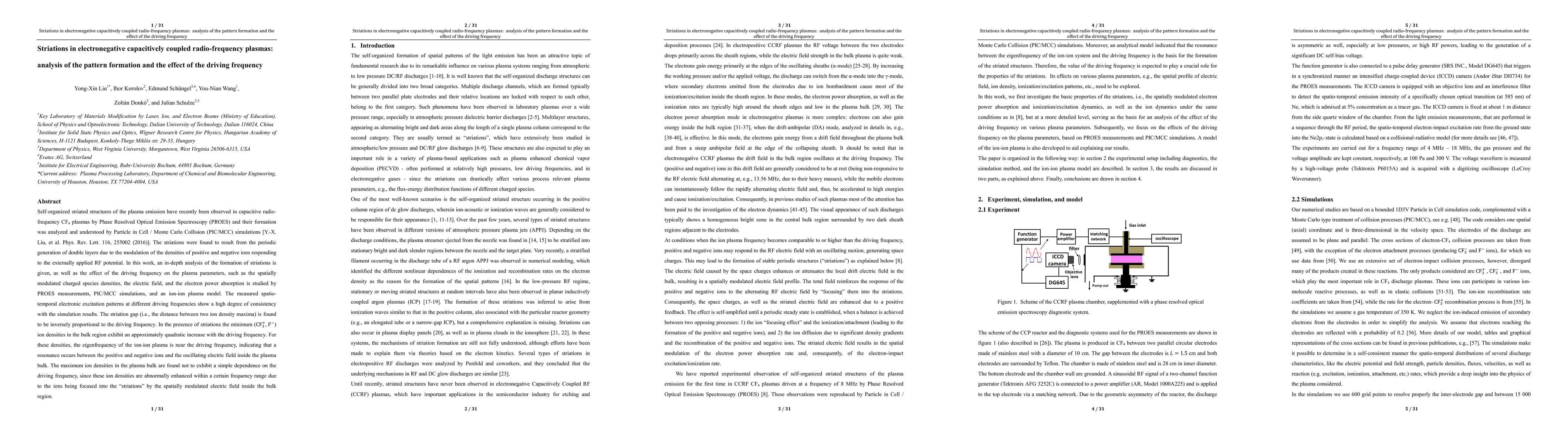This paper investigates the formation of striations in CF4 plasmas and their dependence on the driving frequency, using PROES, PIC/MCC simulations, and an ion-ion plasma model. The study finds that striations arise from double layers due to the modulation of ion densities, and the striation gap inversely correlates with the driving frequency, while minimum ion densities show a quadratic increase with frequency, indicating resonance effects.