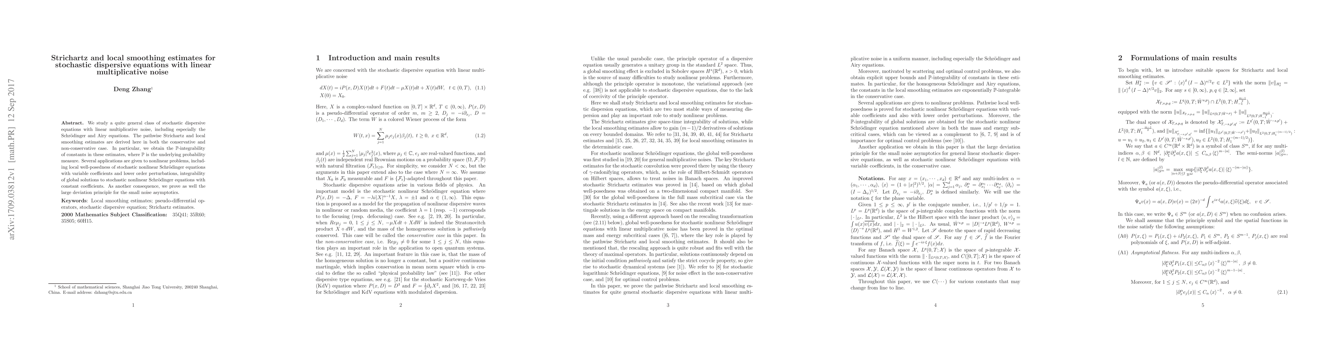 This paper derives Strichartz and local smoothing estimates for stochastic dispersive equations with linear multiplicative noise, including Schrödinger and Airy equations. The study provides P-integrability of constants in these estimates and applies the results to local well-posedness and integrability of solutions for stochastic nonlinear Schrödinger equations.