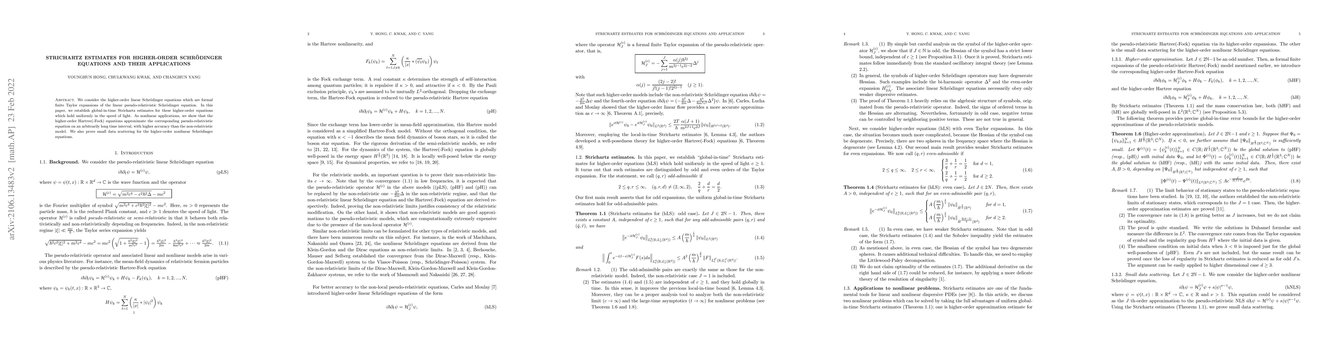 This paper establishes global-in-time Strichartz estimates for higher-order linear Schrödinger equations, demonstrating uniform validity across different speeds of light. It also shows that higher-order Hartree-Fock equations provide a more accurate approximation of pseudo-relativistic equations over long time intervals compared to non-relativistic equations, and proves small data scattering for higher-order nonlinear Schrödinger equations.