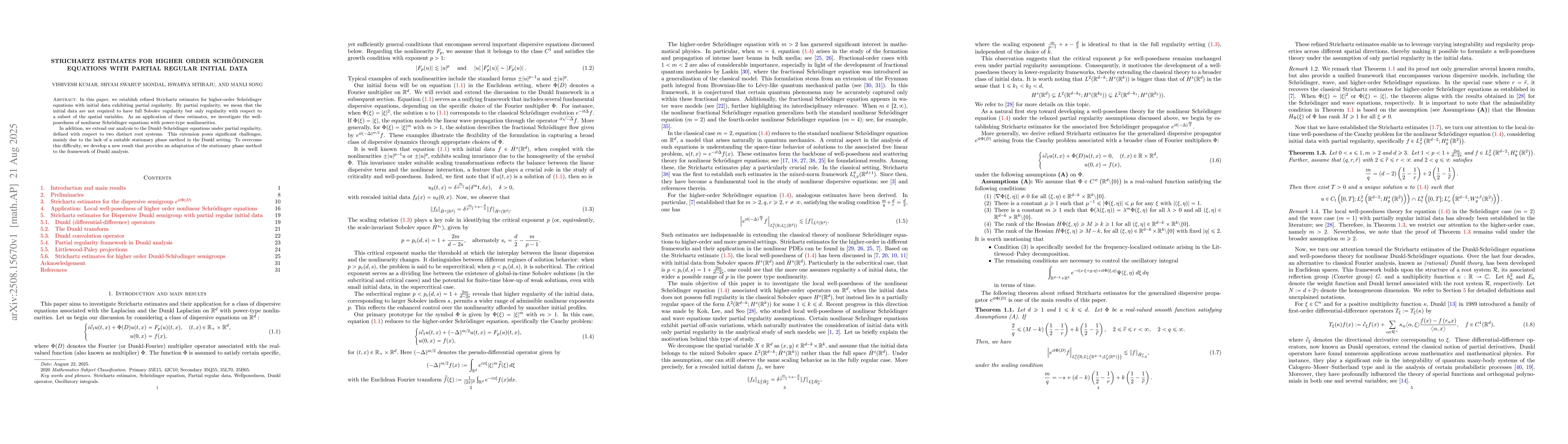 In this paper, we establish refined Strichartz estimates for higher-order Schr\"odinger equations with initial data exhibiting partial regularity. By partial regularity, we mean that the initial data are not required to have full Sobolev regularity but only regularity with respect to a subset of the spatial variables. As an application of these estimates, we investigate the well-posedness of nonlinear Schr\"odinger equations with power-type nonlinearities. In addition, we extend our analysis to the Dunkl Schr\"odinger equations under partial regularity, defined with respect to two distinct root systems. This extension poses significant challenges, mainly due to the lack of a suitable stationary phase method in the Dunkl setting. To overcome this difficulty, we develop a new result that provides an adaptation of the stationary phase method to the framework of Dunkl analysis.