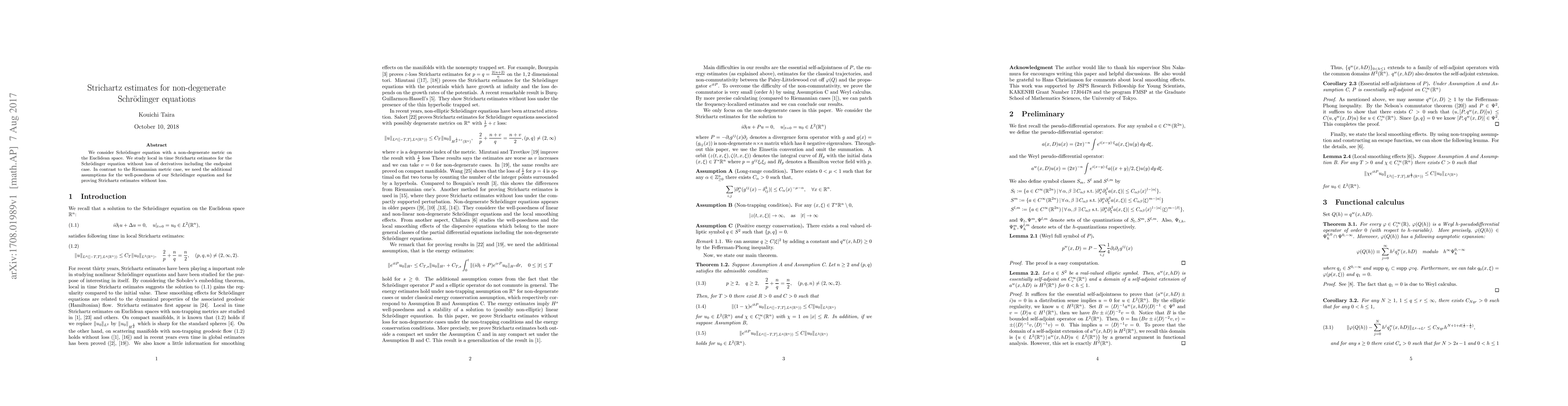 This paper investigates local Strichartz estimates for a non-degenerate Schrödinger equation in Euclidean space, focusing on cases without derivative loss, including the endpoint scenario. Unlike the Riemannian case, it requires additional assumptions for well-posedness and proving the Strichartz estimates.