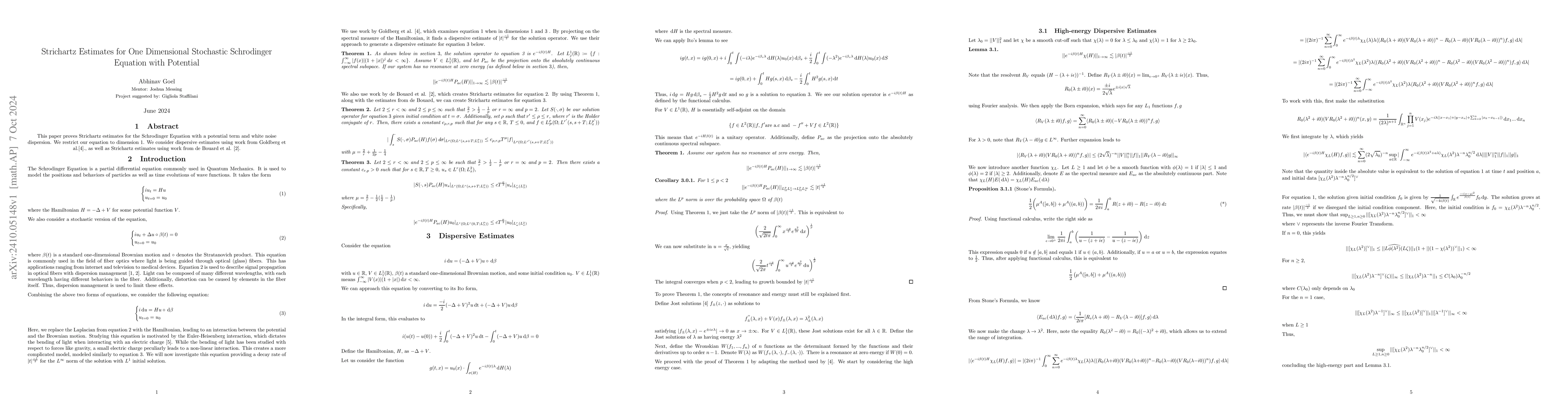 Summary: This paper establishes Strichartz estimates for the one-dimensional stochastic Schrödinger equation incorporating a potential term and white noise dispersion. It further leverages existing dispersive estimates to enhance understanding in the field.