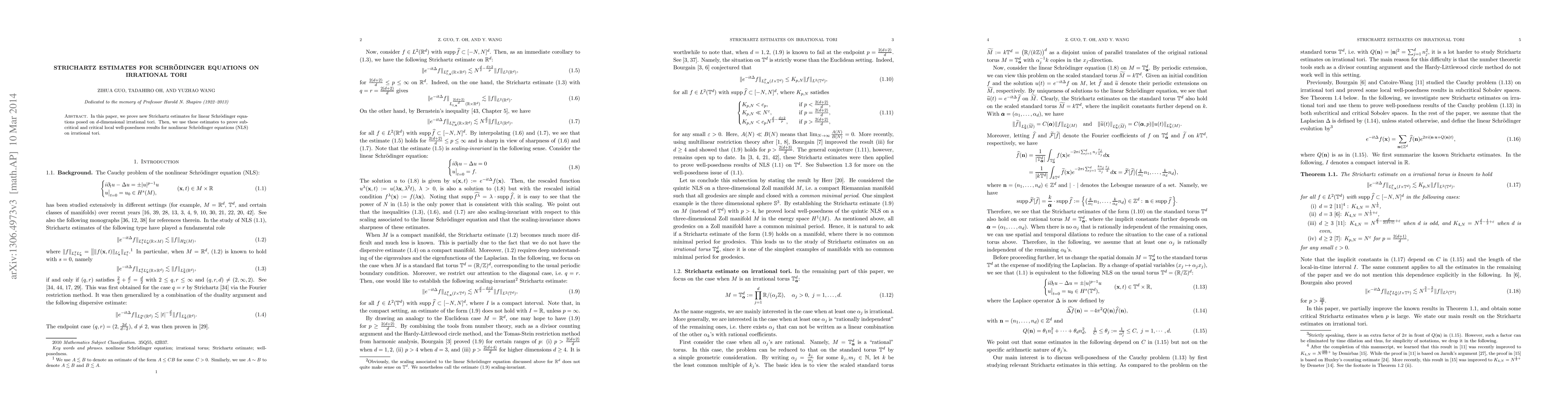 This paper establishes novel Strichartz estimates for linear Schrödinger equations on d-dimensional irrational tori and utilizes these estimates to demonstrate subcritical and critical local well-posedness for nonlinear Schrödinger equations on the same irrational tori.