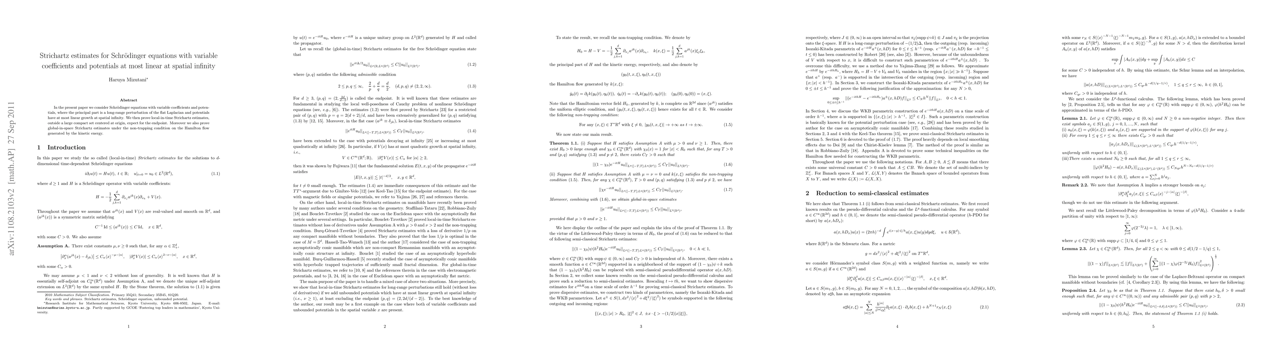This paper proves local-in-time Strichartz estimates for Schrödinger equations with variable coefficients and linear potentials, focusing on regions outside a large compact set. It also establishes global-in-space Strichartz estimates under a non-trapping condition on the associated Hamilton flow.