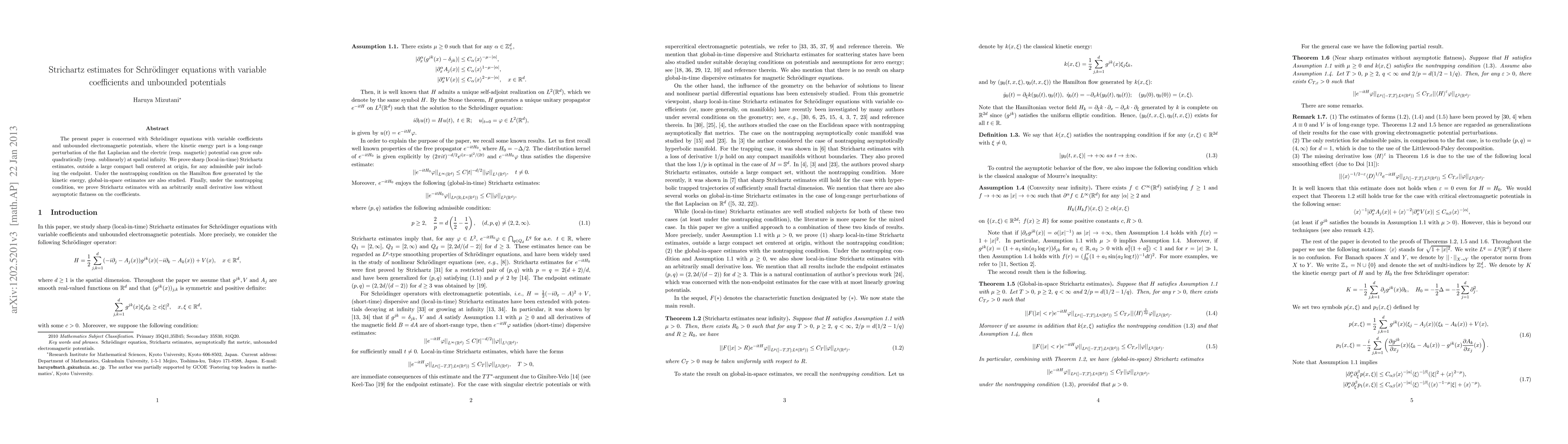This paper proves sharp Strichartz estimates for Schrödinger equations with variable coefficients and unbounded potentials, focusing on long-range perturbations and subquadratic/sublinear growth of potentials. It also explores global-in-space estimates under nontrapping conditions and Strichartz estimates with minimal derivative loss without requiring asymptotic flatness.