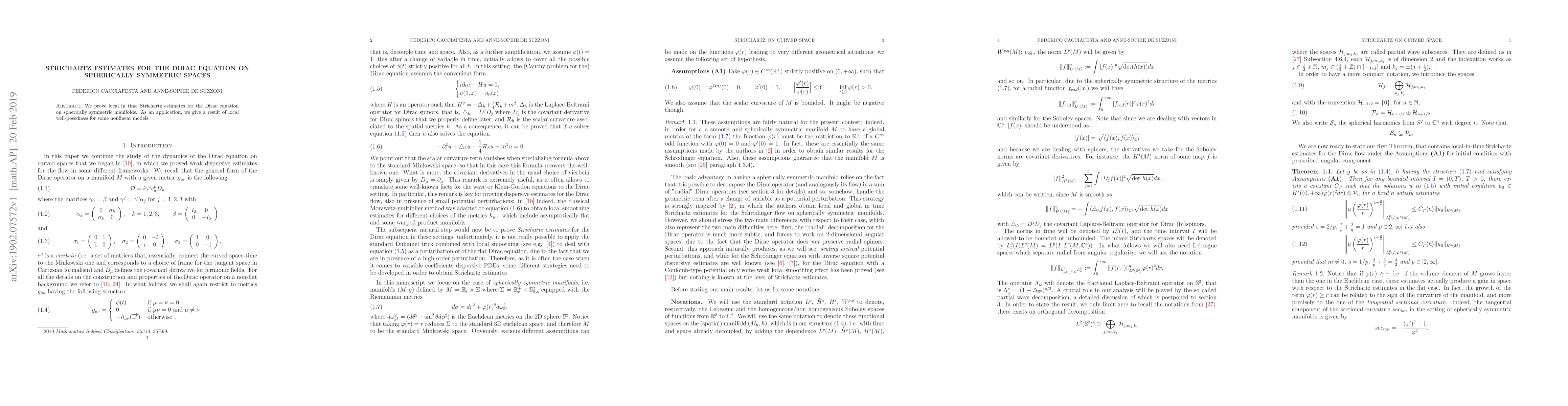 Summary: This paper establishes local in time Strichartz estimates for the Dirac equation on spherically symmetric manifolds, and applies these estimates to demonstrate local well-posedness for certain nonlinear models.