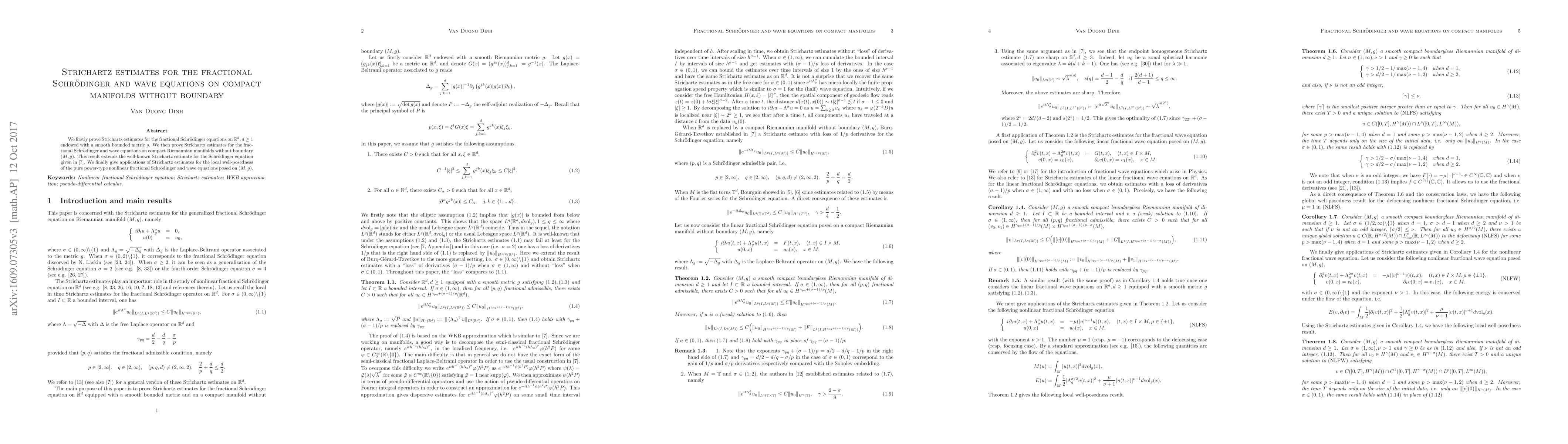 We firstly prove Strichartz estimates for the fractional Schr\"odinger equations on $\mathbb{R}^d$ endowed with a smooth bounded metric $g$. We then prove Strichartz estimates for the fractional Schr\"odinger and wave equations on compact Riemannian manifolds without boundary $(M,g)$. We finally give applications of Strichartz estimates for the local well-posedness of the pure power-type nonlinear fractional Schr\"odinger and wave equations posed on $(M,g)$.