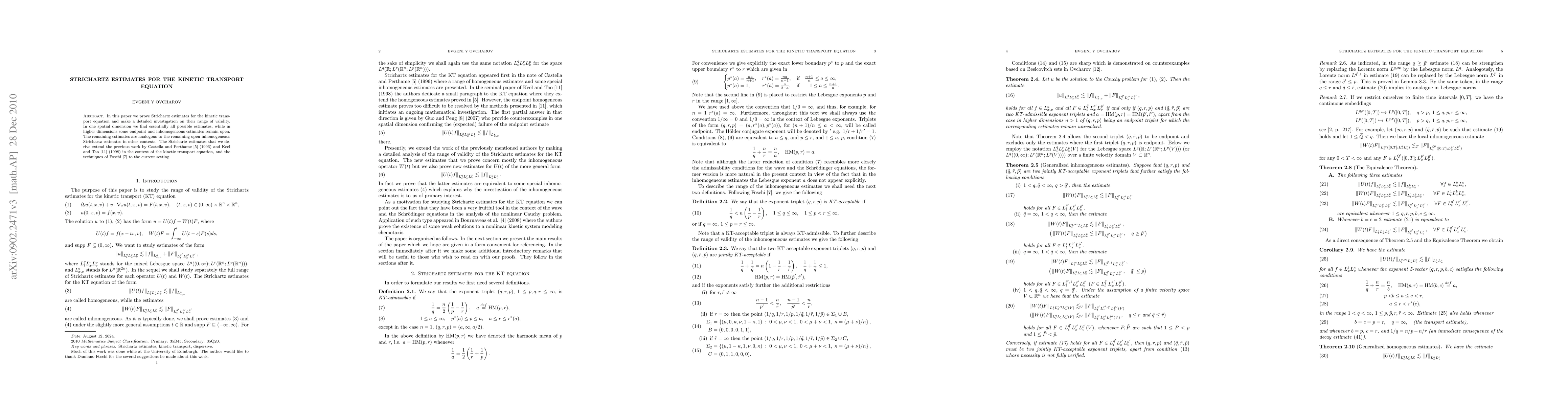 Summary: This paper establishes new Strichartz estimates for the kinetic transport equation, significantly expanding the existing range of known results in the literature. These estimates are crucial for understanding the equation's behavior and applications.