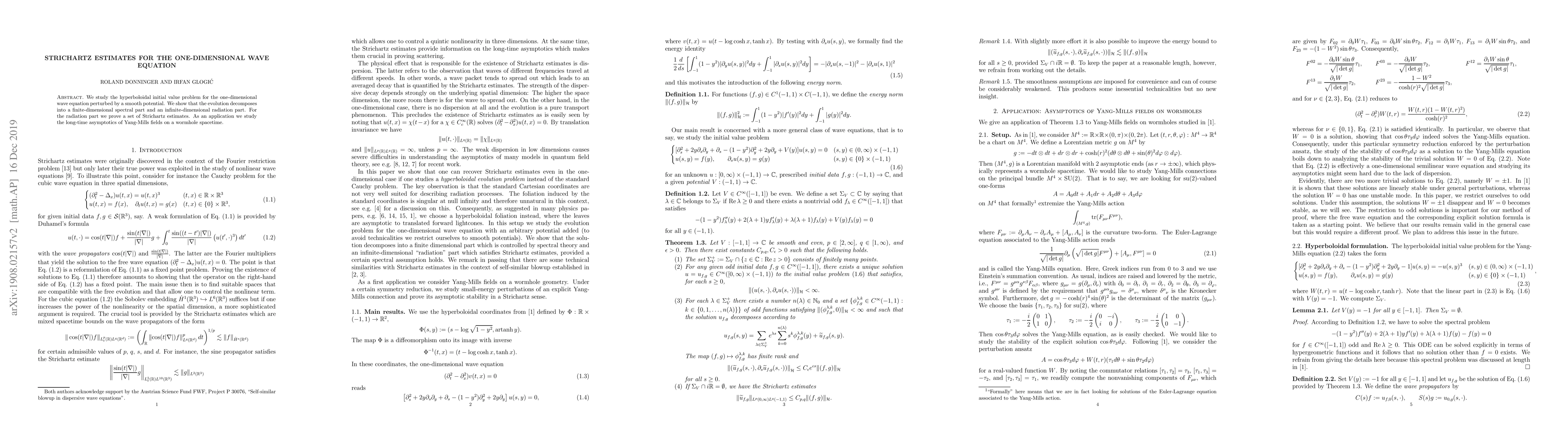 This paper investigates the hyperboloidal initial value problem for the one-dimensional wave equation with a smooth potential, demonstrating a decomposition into finite-dimensional spectral and infinite-dimensional radiation parts. It proves Strichartz estimates for the radiation part and applies these to study the long-time behavior of Yang-Mills fields on a wormhole spacetime.