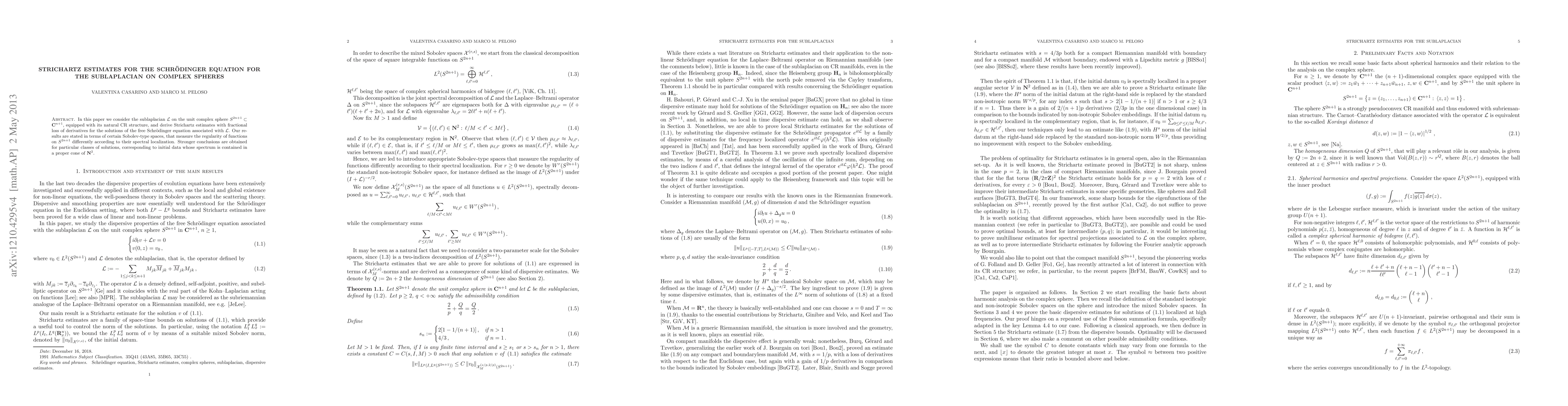 This research proves Strichartz estimates with fractional derivative loss for the Schrödinger equation on complex spheres, establishing local-in-time well-posedness. The estimates apply to specific solution classes with initial data spectrum inside a cone of N^2, utilizing Sobolev-type spaces for regularity measurement.