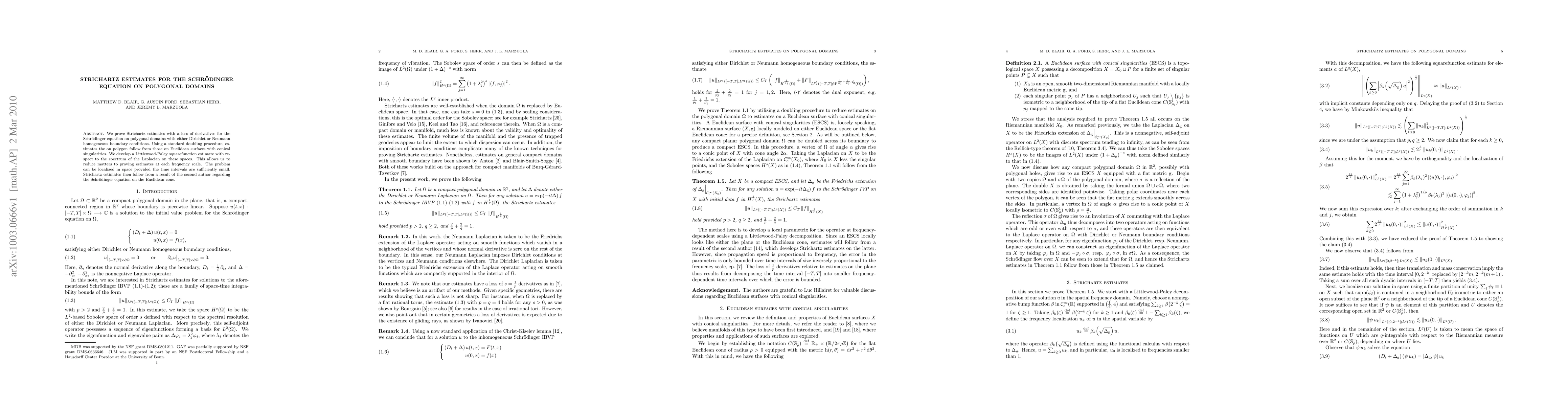 This paper proves Strichartz estimates for the Schrödinger equation on polygonal domains with Dirichlet or Neumann boundary conditions, leveraging a doubling procedure and Littlewood-Paley squarefunction estimates. The estimates are derived by reducing the problem to proving them at each frequency scale, ultimately using results from the Euclidean cone.