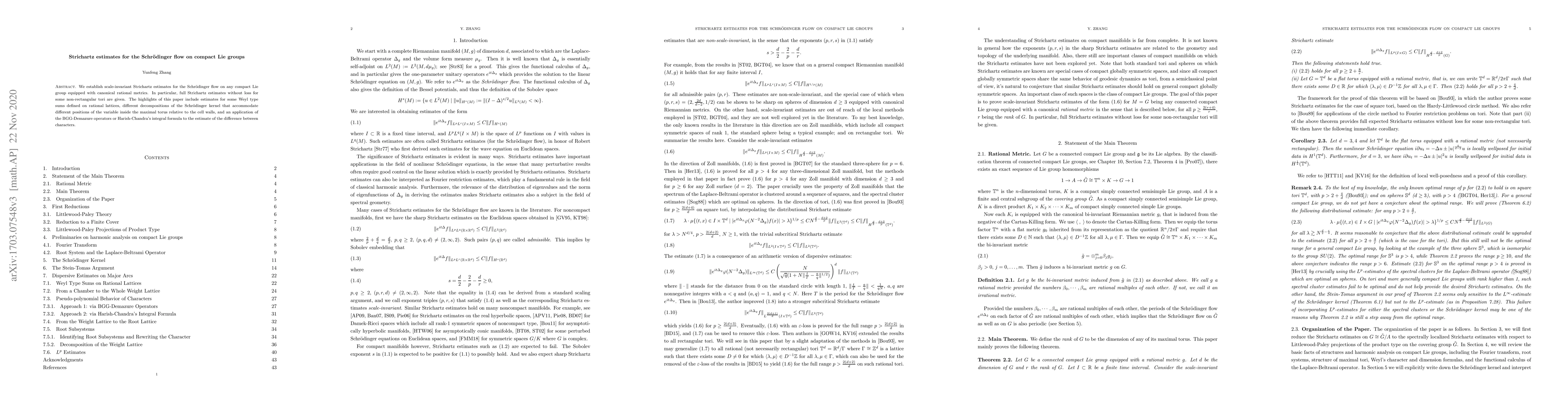 This paper establishes scale-invariant Strichartz estimates for the Schrödinger flow on compact Lie groups with rational metrics, providing full estimates without loss for certain non-rectangular tori. It also explores Weyl type sums on rational lattices and applies BGG-Demazure operators or Harish-Chandra's integral formula for character difference estimation.