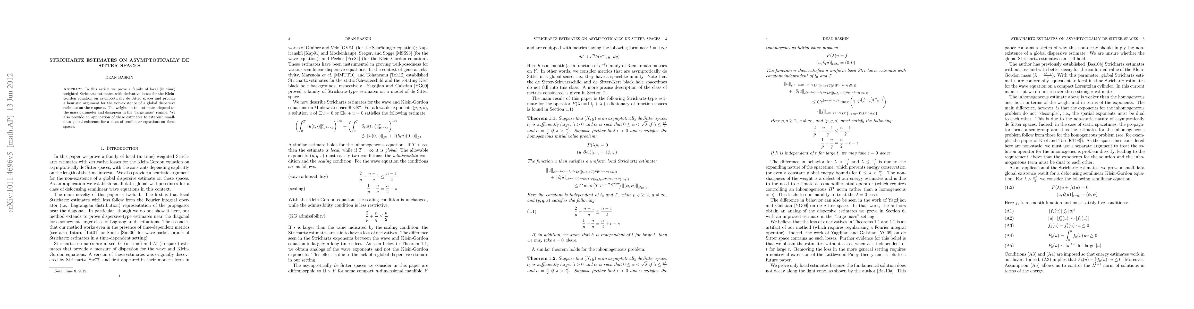 This paper proves local weighted Strichartz estimates for the Klein-Gordon equation on asymptotically de Sitter spaces, showing the non-existence of global dispersive estimates and applying these results to establish small-data global existence for semilinear equations. The estimates' weights vanish in the large mass regime.