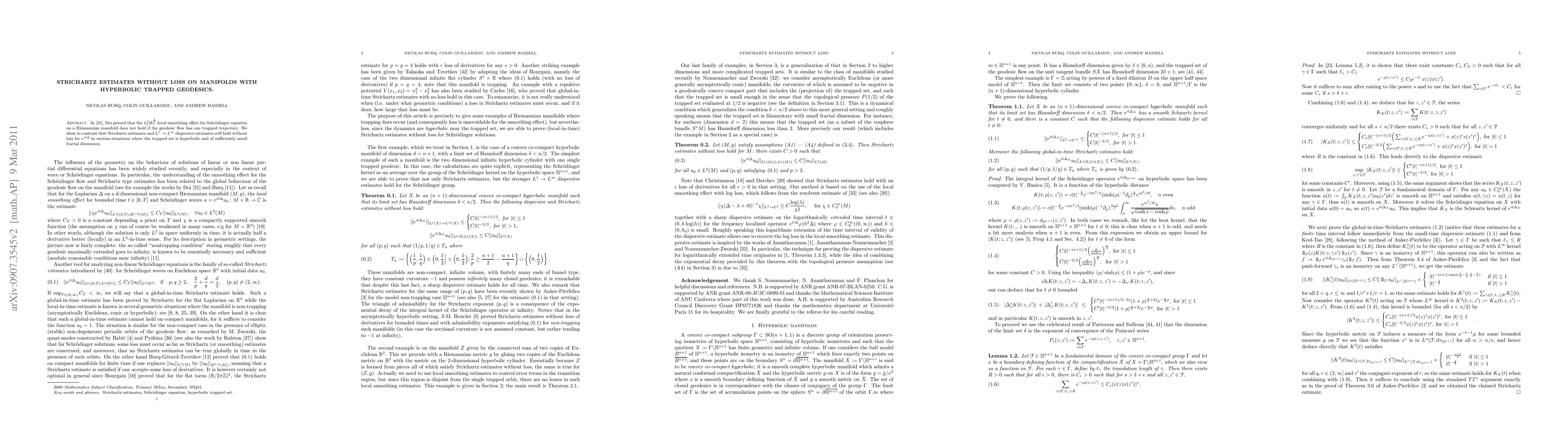 This paper demonstrates that Strichartz and $L^1\to L^\infty$ dispersive estimates remain valid without loss for the Laplacian on manifolds with hyperbolic trapped geodesics, despite the absence of the $L^2_t H^{1/2}_x$ local smoothing effect. The results hold when the trapped set has a sufficiently small fractal dimension.