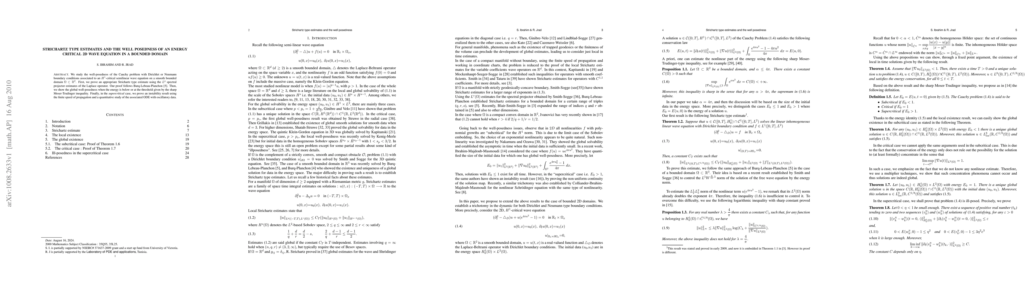This research establishes well-posedness for a specific type of 2D wave equation in bounded domains, using Strichartz estimates and spectral projector techniques. It also proves global well-posedness for energy below a critical threshold and demonstrates instability in the supercritical case through finite speed of propagation and ODE analysis.