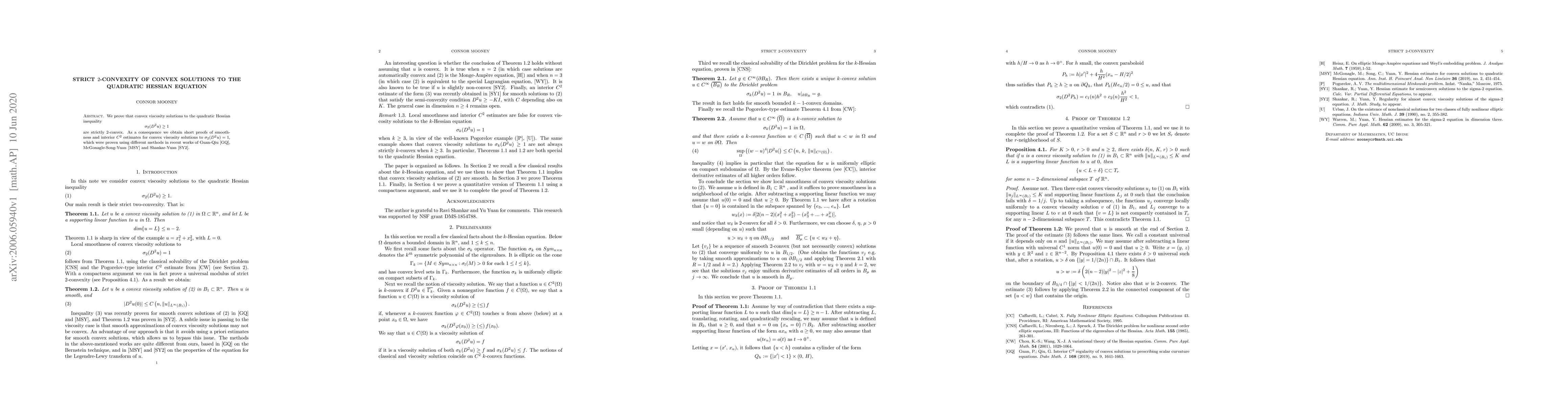 We prove that convex viscosity solutions to the quadratic Hessian inequality $\sigma_2(D^2u) \geq 1$ are strictly $2$-convex. As a consequence we obtain short proofs of smoothness and interior $C^2$ estimates for convex viscosity solutions to $\sigma_2(D^2u) = 1$, which were proven using different methods in recent works of Guan-Qiu \cite{GQ}, McGonagle-Song-Yuan \cite{MSY} and Shankar-Yuan \cite{SY2}.