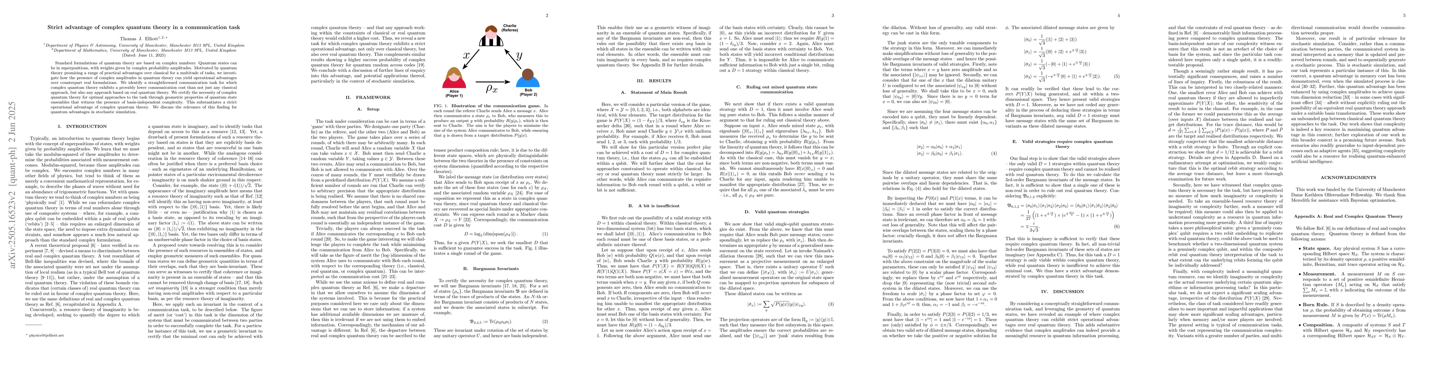 This work distinguishes itself by providing a concrete example of a communication task where complex quantum theory offers a strict advantage over both classical and real quantum formulations, supported by theoretical proofs.