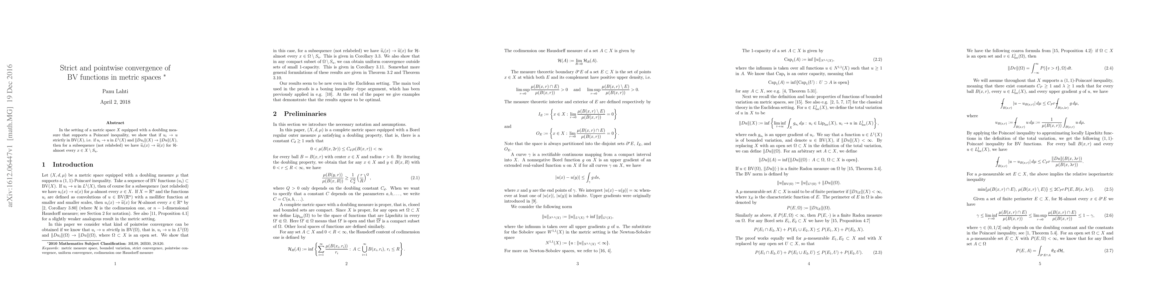In the setting of a metric space $X$ equipped with a doubling measure that supports a Poincar\'e inequality, we show that if $u_i\to u$ strictly in $BV(X)$, i.e. if $u_i\to u$ in $L^1(X)$ and $\Vert Du_i\Vert(X)\to\Vert Du\Vert(X)$, then for a subsequence (not relabeled) we have $\widetilde{u}_i(x)\to \widetilde{u}(x)$ for $\mathcal H$-almost every $x\in X\setminus S_u$.