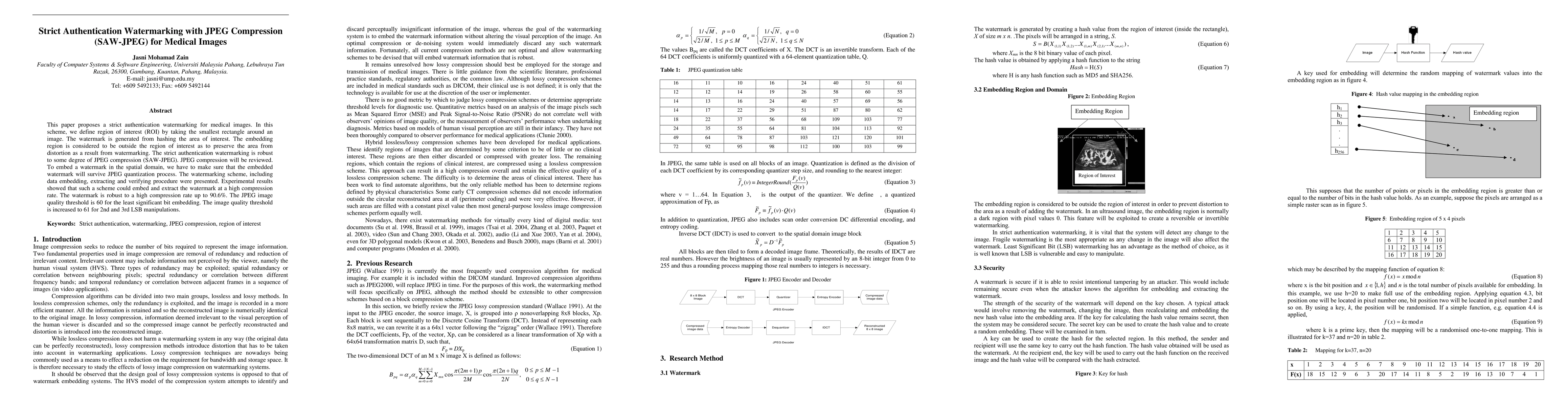 This paper introduces a strict authentication watermarking scheme (SAW-JPEG) for medical images, embedding a watermark outside the region of interest to preserve image quality. The watermark is robust to JPEG compression up to 90.6%, maintaining integrity even at high compression rates.