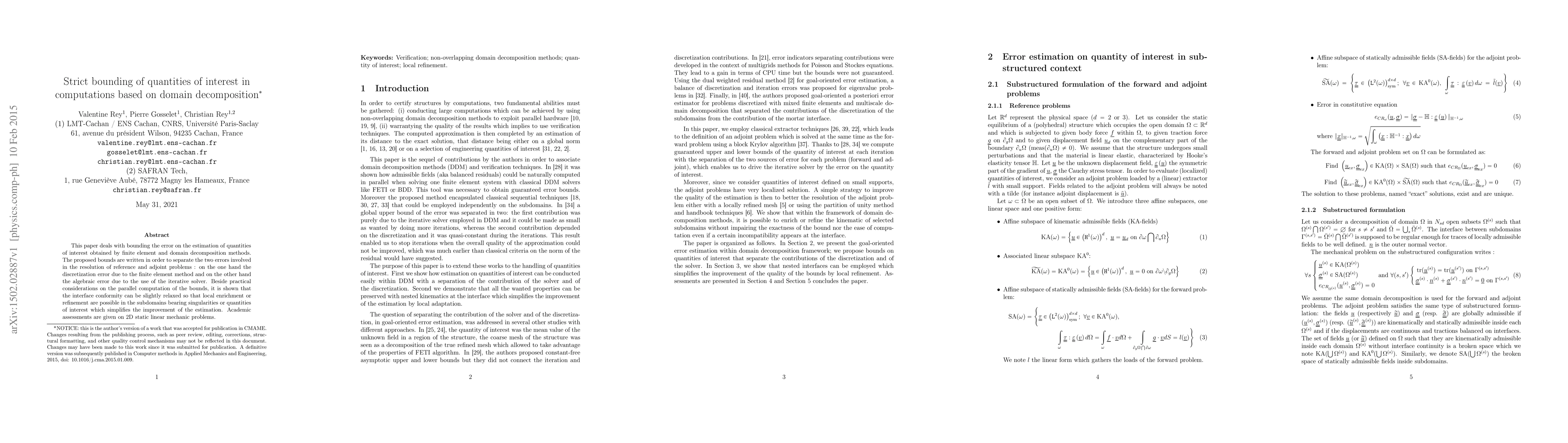 This paper presents error bounds for quantities of interest in finite element and domain decomposition methods, distinguishing discretization and algebraic errors. It also explores relaxed interface conformity for localized enrichment or refinement near singularities, supported by 2D static linear mechanics problem assessments.
