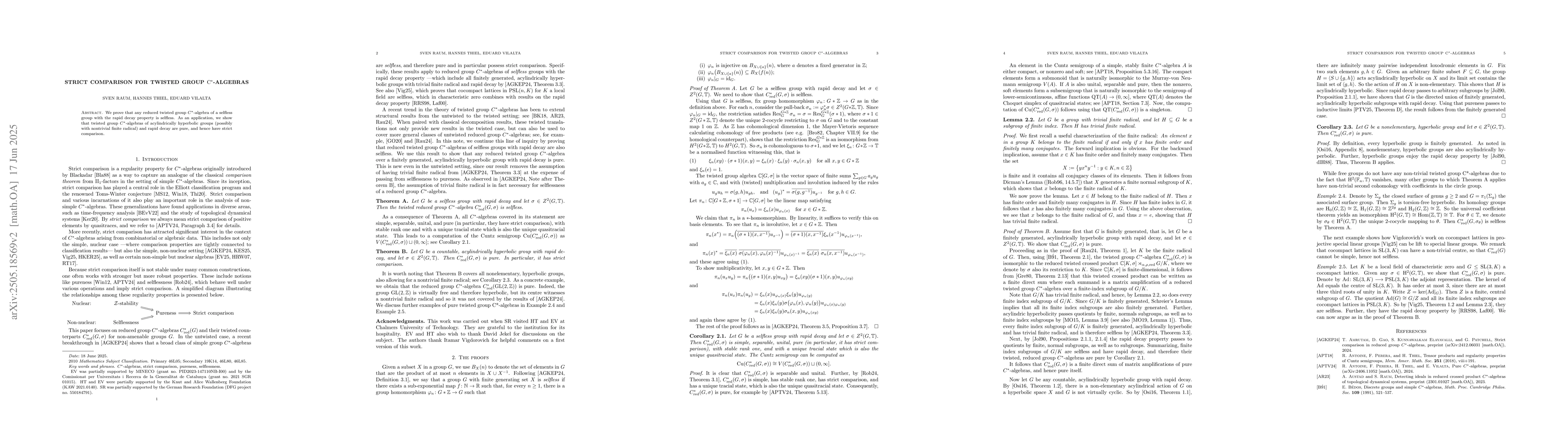 The proof of selflessness for reduced twisted group C*-algebras of selfless groups with rapid decay, and the demonstration of purity and strict comparison for twisted group C*-algebras of acylindrically hyperbolic groups.