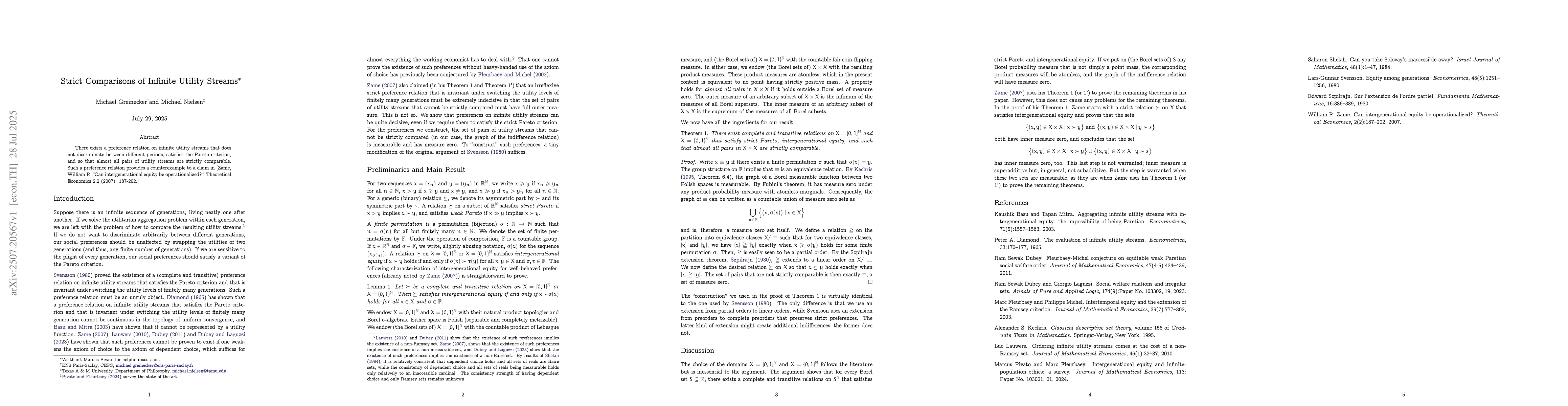 The paper constructs preferences on infinite utility streams by modifying Svensson's original argument, ensuring the relation satisfies strict Pareto, intergenerational equity, and comparability for almost all pairs with measure zero.