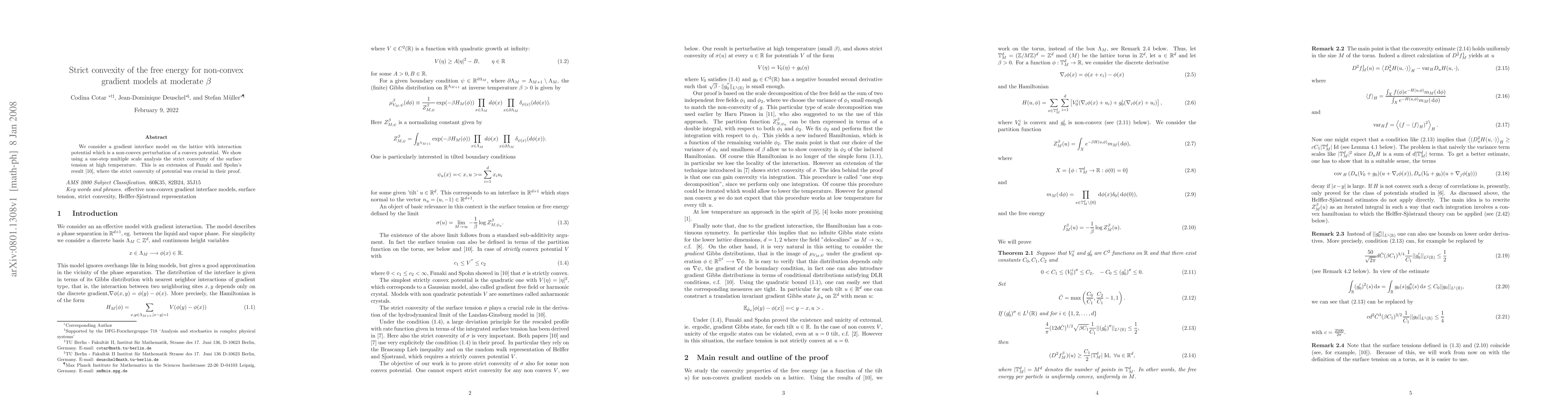This paper demonstrates the strict convexity of the surface tension in a non-convex gradient interface model at moderate temperatures using a one-step multiple scale analysis, extending previous results on the convexity of potentials. This finding supports the existence of a unique, shift invariant, ergodic Gibbs measure for the gradient field.