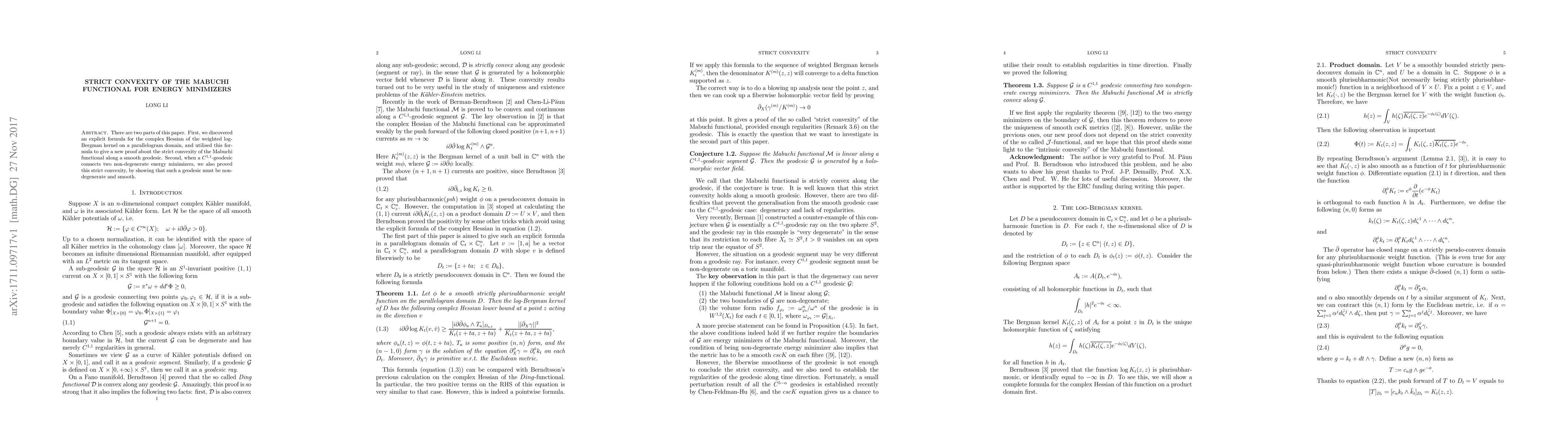 This paper provides a new proof of the strict convexity of the Mabuchi functional along smooth geodesics using an explicit formula for the complex Hessian of the weighted log-Bergman kernel. It further proves strict convexity for C^{1,1}-geodesics connecting two non-degenerate energy minimizers by demonstrating the geodesic's non-degeneracy and smoothness.