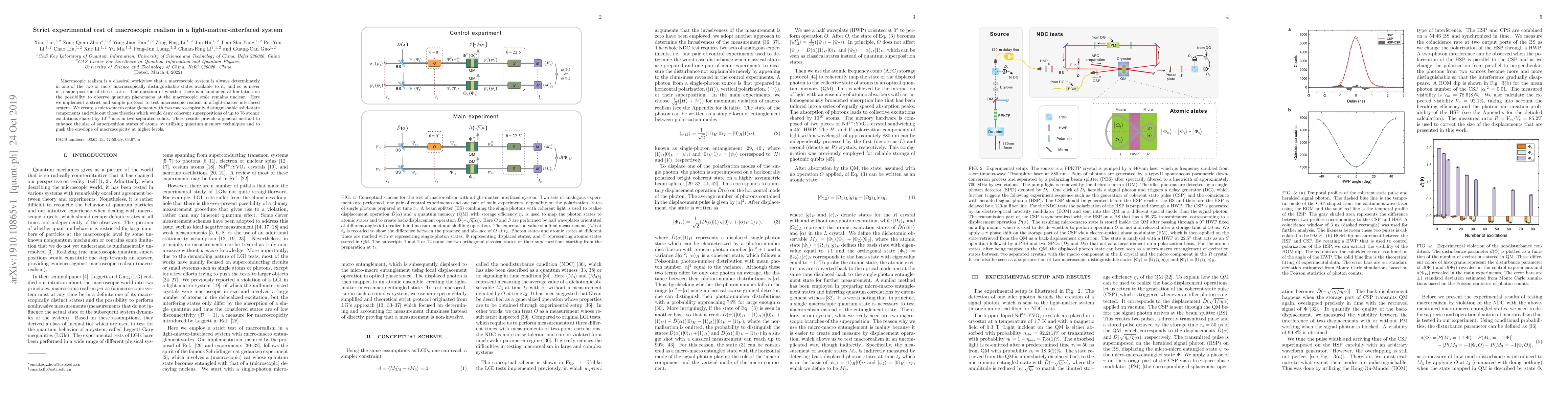 This paper tests macroscopic realism by creating micro-macro entanglement in a light-matter interfaced system, ruling out theories that deny superpositions of up to 76 atomic excitations shared by 10^10 ions in two separated solids, thus advancing the understanding of quantum phenomena at the macroscopic scale.