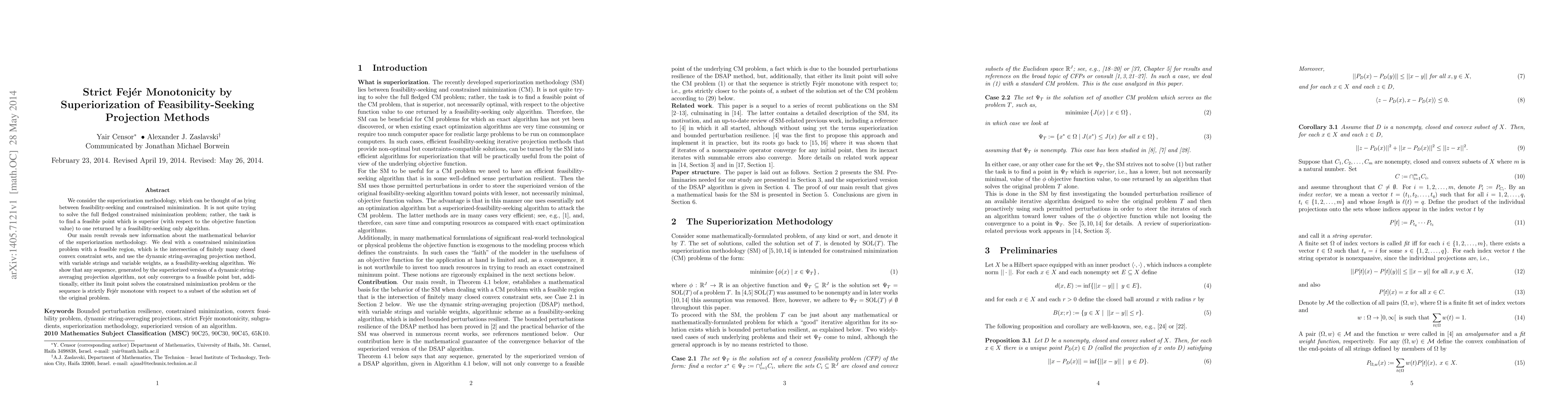We consider the superiorization methodology, which can be thought of as lying between feasibility-seeking and constrained minimization. It is not quite trying to solve the full fledged constrained minimization problem; rather, the task is to find a feasible point which is superior (with respect to the objective function value) to one returned by a feasibility-seeking only algorithm. Our main result reveals new information about the mathematical behavior of the superiorization methodology. We deal with a constrained minimization problem with a feasible region, which is the intersection of finitely many closed convex constraint sets, and use the dynamic string-averaging projection method, with variable strings and variable weights, as a feasibility-seeking algorithm. We show that any sequence, generated by the superiorized version of a dynamic string-averaging projection algorithm, not only converges to a feasible point but, additionally, either its limit point solves the constrained minimization problem or the sequence is strictly Fej\'er monotone with respect to a subset of the solution set of the original problem.