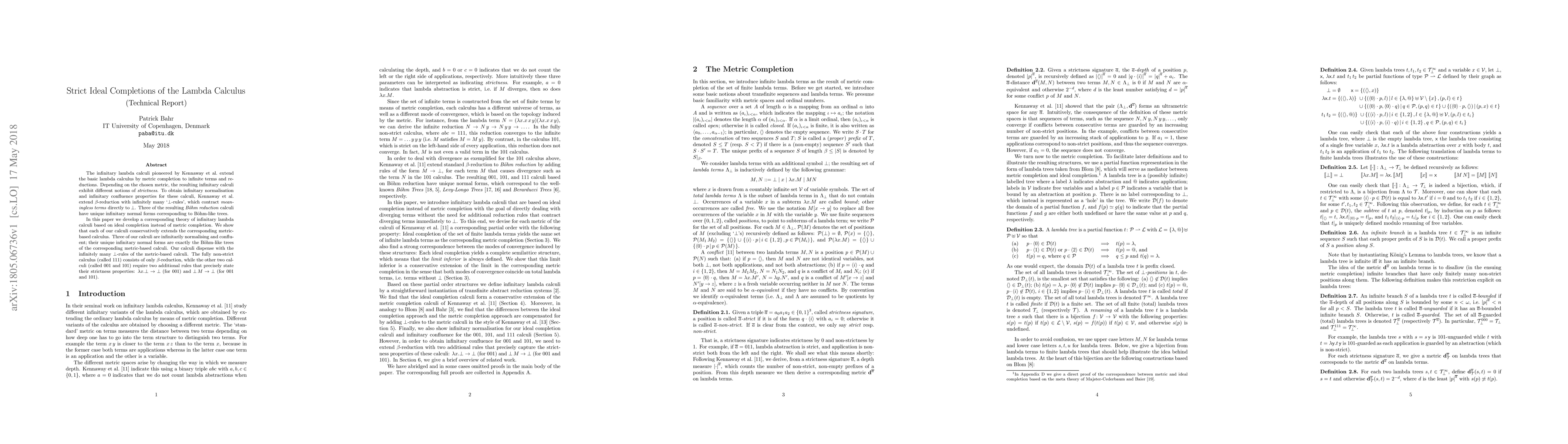 The infinitary lambda calculi pioneered by Kennaway et al. extend the basic lambda calculus by metric completion to infinite terms and reductions. Depending on the chosen metric, the resulting infinitary calculi exhibit different notions of strictness. To obtain infinitary normalisation and infinitary confluence properties for these calculi, Kennaway et al. extend $\beta$-reduction with infinitely many `$\bot$-rules', which contract meaningless terms directly to $\bot$. Three of the resulting B\"ohm reduction calculi have unique infinitary normal forms corresponding to B\"ohm-like trees. In this paper we develop a corresponding theory of infinitary lambda calculi based on ideal completion instead of metric completion. We show that each of our calculi conservatively extends the corresponding metric-based calculus. Three of our calculi are infinitarily normalising and confluent; their unique infinitary normal forms are exactly the B\"ohm-like trees of the corresponding metric-based calculi. Our calculi dispense with the infinitely many $\bot$-rules of the metric-based calculi. The fully non-strict calculus (called $111$) consists of only $\beta$-reduction, while the other two calculi (called $001$ and $101$) require two additional rules that precisely state their strictness properties: $\lambda x.\bot \to \bot$ (for $001$) and $\bot\,M \to \bot$ (for $001$ and $101$).