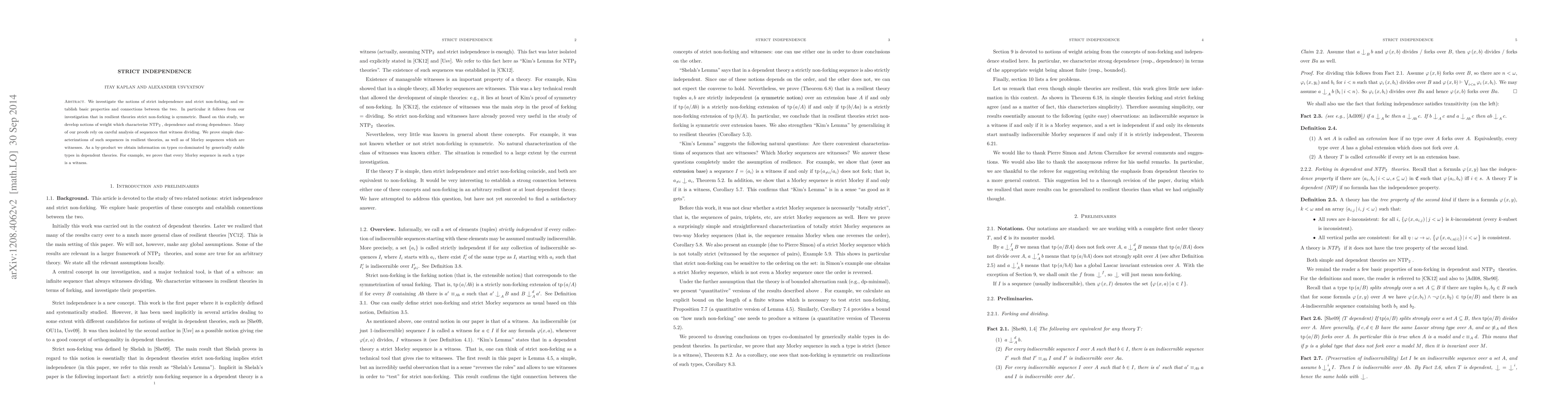 We investigate the notions of strict independence and strict non-forking, and establish basic properties and connections between the two. In particular it follows from our investigation that in resilient theories strict non-forking is symmetric. Based on this study, we develop notions of weight which characterize NTP2, dependence and strong dependence. Many of our proofs rely on careful analysis of sequences that witness dividing. We prove simple characterizations of such sequences in resilient theories, as well as of Morley sequences which are witnesses. As a by-product we obtain information on types co-dominated by generically stable types in dependent theories. For example, we prove that every Morley sequence in such a type is a witness.