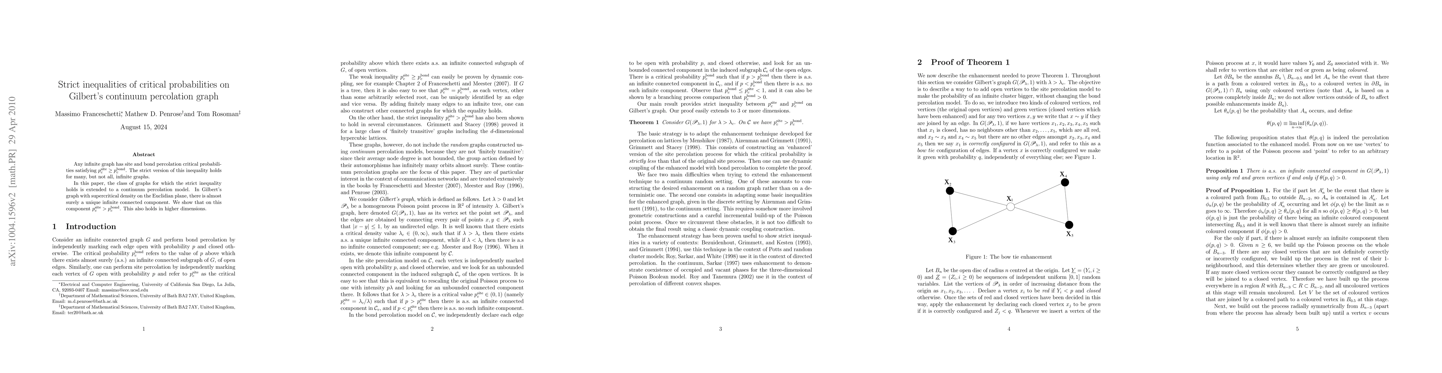 This paper extends the strict inequality between site and bond percolation critical probabilities to Gilbert's continuum percolation model on the Euclidean plane. It demonstrates that in supercritical density conditions, the site percolation critical probability is strictly greater than the bond percolation critical probability.