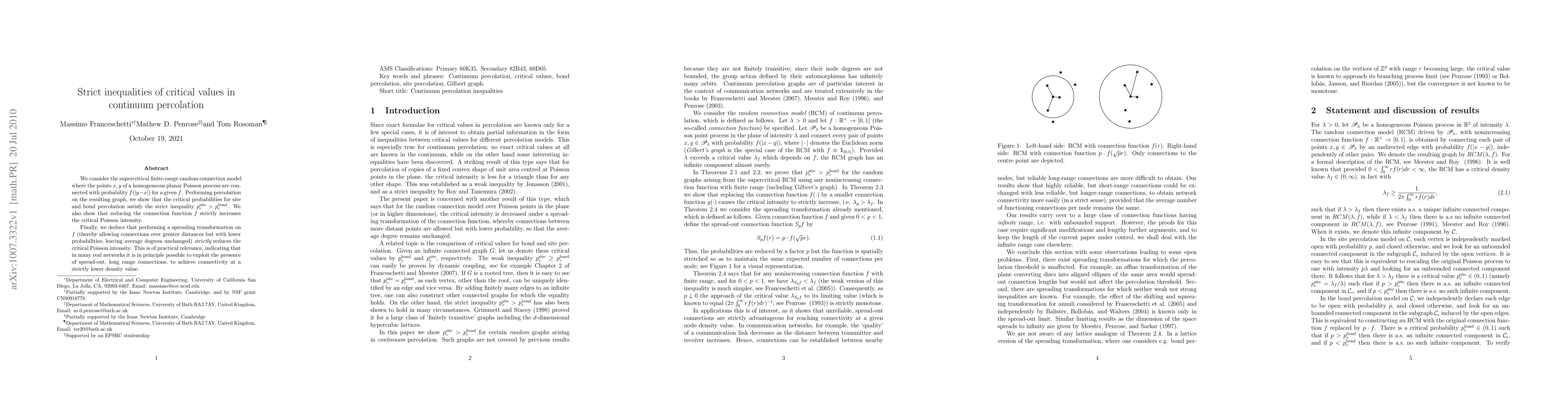 We consider the supercritical finite-range random connection model where the points $x,y$ of a homogeneous planar Poisson process are connected with probability $f(|y-x|)$ for a given $f$. Performing percolation on the resulting graph, we show that the critical probabilities for site and bond percolation satisfy the strict inequality $p_c^{\rm site} > p_c^{\rm bond}$. We also show that reducing the connection function $f$ strictly increases the critical Poisson intensity. Finally, we deduce that performing a spreading transformation on $f$ (thereby allowing connections over greater distances but with lower probabilities, leaving average degrees unchanged) {\em strictly} reduces the critical Poisson intensity. This is of practical relevance, indicating that in many real networks it is in principle possible to exploit the presence of spread-out, long range connections, to achieve connectivity at a strictly lower density value.