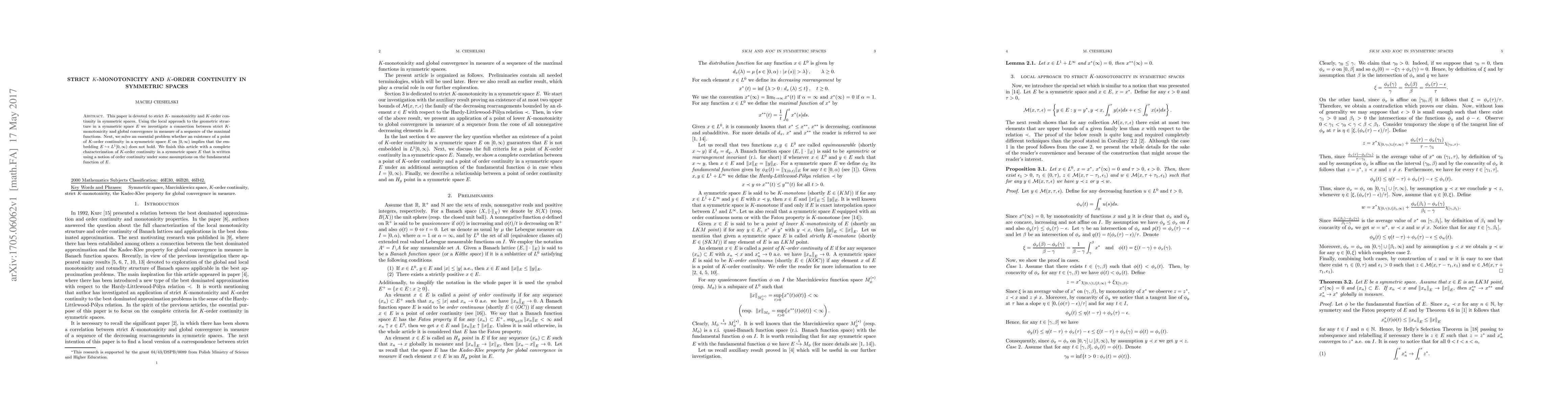 This paper explores strict $K$-monotonicity and $K$-order continuity in symmetric spaces, establishing a link between strict $K$-monotonicity and global convergence in measure of maximal functions. It also determines whether the existence of a $K$-order continuity point implies the non-existence of $E \hookrightarrow L^1[0,\infty)$ embedding.