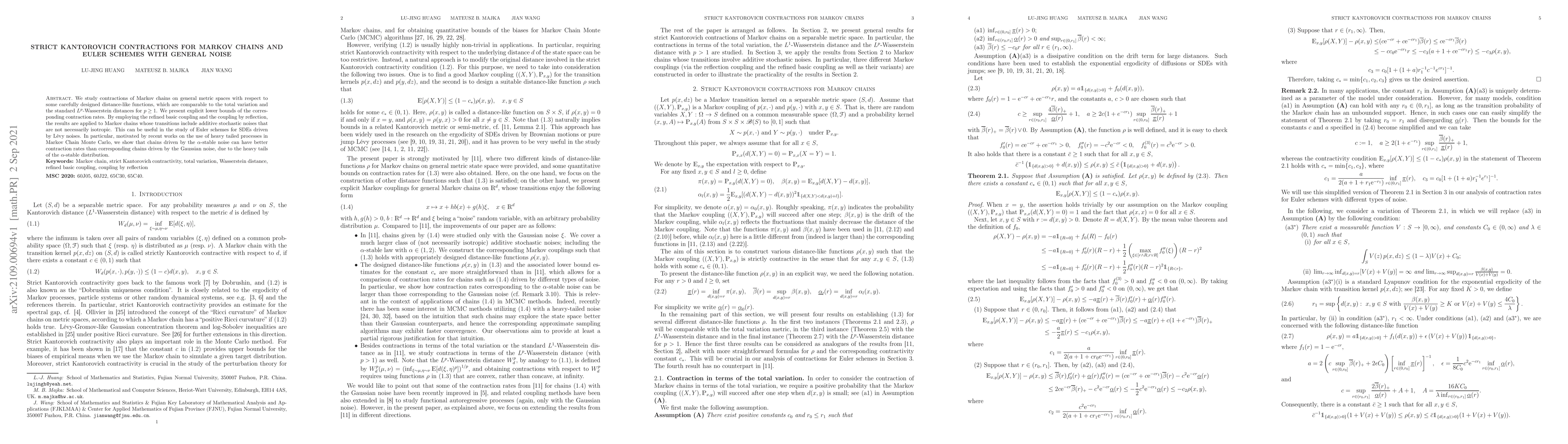We study contractions of Markov chains on general metric spaces with respect to some carefully designed distance-like functions, which are comparable to the total variation and the standard $L^p$-Wasserstein distances for $p \ge 1$. We present explicit lower bounds of the corresponding contraction rates. By employing the refined basic coupling and the coupling by reflection, the results are applied to Markov chains whose transitions include additive stochastic noises that are not necessarily isotropic. This can be useful in the study of Euler schemes for SDEs driven by L\'evy noises. In particular, motivated by recent works on the use of heavy tailed processes in Markov Chain Monte Carlo, we show that chains driven by the $\alpha$-stable noise can have better contraction rates than corresponding chains driven by the Gaussian noise, due to the heavy tails of the $\alpha$-stable distribution.