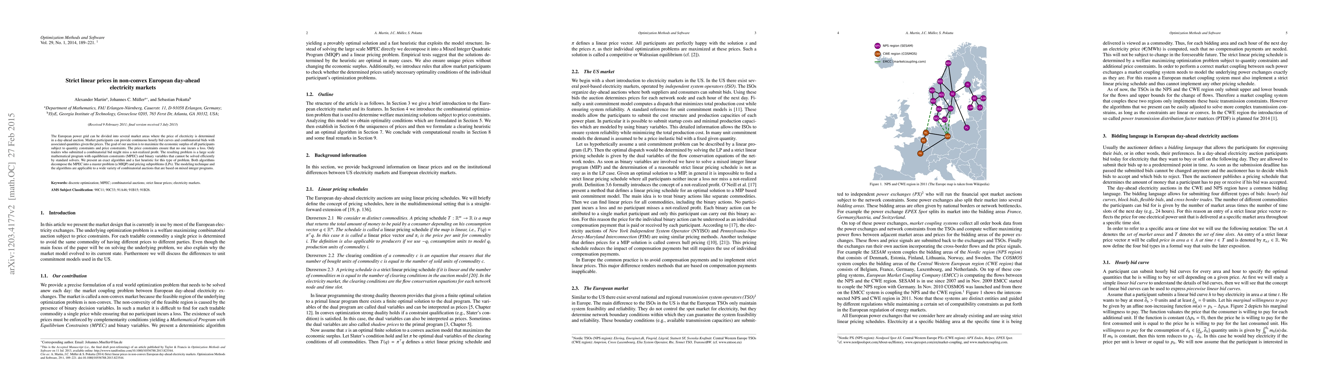 The European power grid can be divided into several market areas where the price of electricity is determined in a day-ahead auction. Market participants can provide continuous hourly bid curves and combinatorial bids with associated quantities given the prices. The goal of our auction is to maximize the economic surplus of all participants subject to quantity constraints and price constraints. The price constraints ensure that no one incurs a loss. Only traders who submitted a combinatorial bid might miss a not-realized profit. The resulting problem is a large scale mathematical program with equilibrium constraints (MPEC) and binary variables that cannot be solved efficiently by standard solvers. We present an exact algorithm and a fast heuristic for this type of problem. Both algorithms decompose the MPEC into a master problem (a MIQP) and pricing subproblems (LPs). The modeling technique and the algorithms are applicable to a wide variety of combinatorial auctions that are based on mixed integer programs.