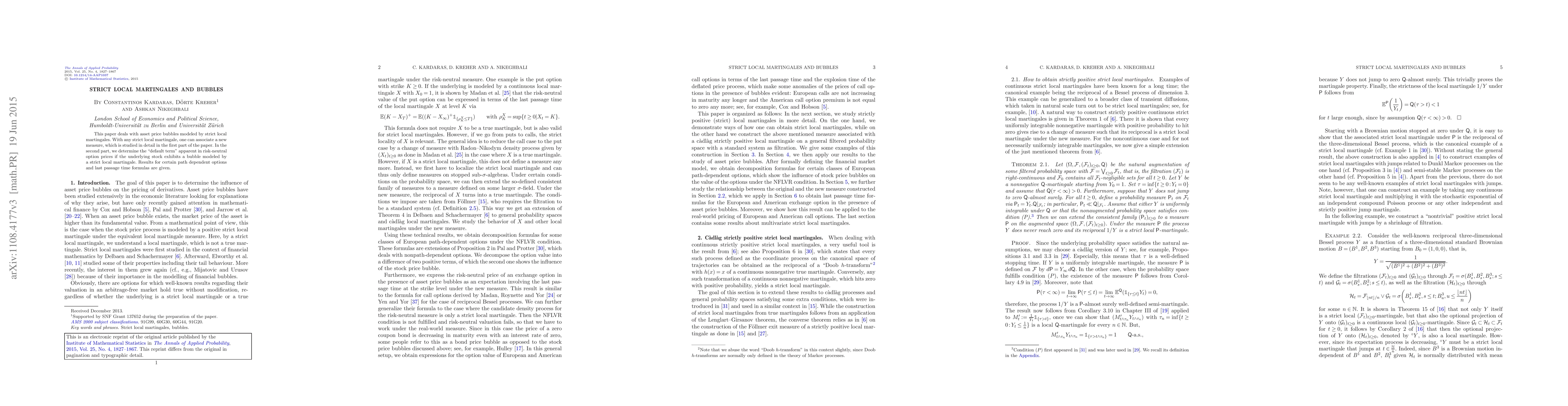 This paper explores asset price bubbles using strict local martingales and introduces a new measure associated with them. It also investigates the "default term" in risk-neutral option prices when the underlying stock is subject to such bubbles, providing results for path-dependent options and last passage time formulas.
