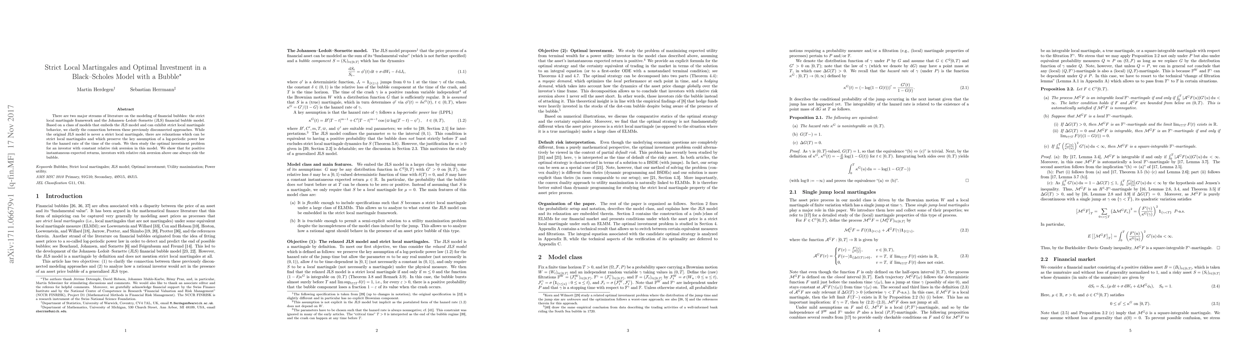 There are two major streams of literature on the modeling of financial bubbles: the strict local martingale framework and the Johansen-Ledoit-Sornette (JLS) financial bubble model. Based on a class of models that embeds the JLS model and can exhibit strict local martingale behavior, we clarify the connection between these previously disconnected approaches. While the original JLS model is never a strict local martingale, there are relaxations which can be strict local martingales and which preserve the key assumption of a log-periodic power law for the hazard rate of the time of the crash. We then study the optimal investment problem for an investor with constant relative risk aversion in this model. We show that for positive instantaneous expected returns, investors with relative risk aversion above one always ride the bubble.