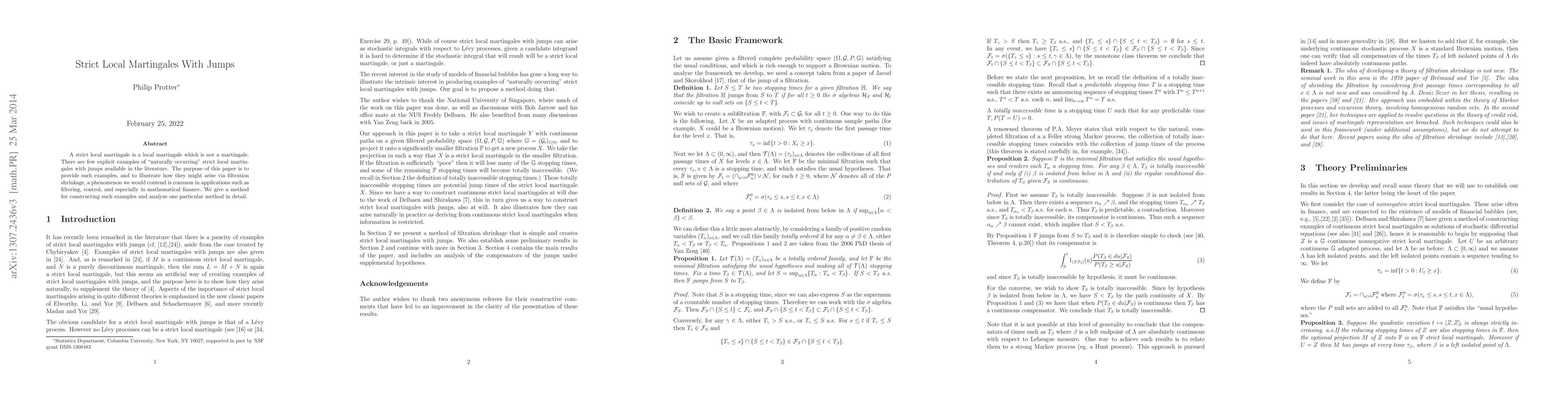 This paper presents explicit examples of "naturally occurring" strict local martingales with jumps, illustrating their emergence through filtration shrinkage. It provides a construction method and analyzes one in detail, highlighting its relevance in applications like filtering, control, and mathematical finance.