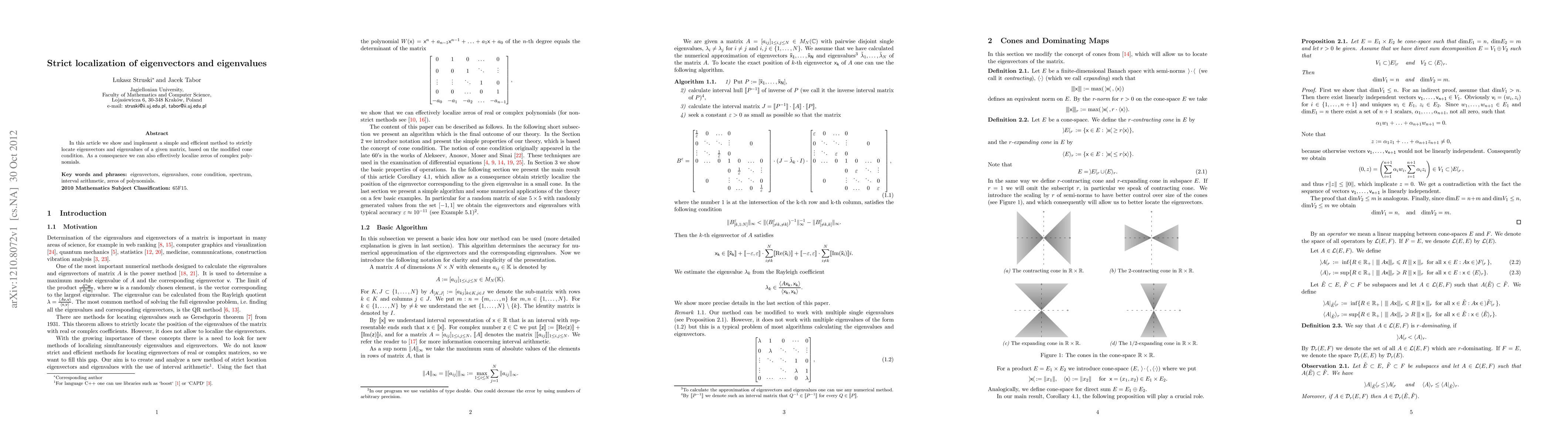 In this article we show and implement a simple and effcient method to strictly locate eigenvectors and eigenvalues of a given matrix, based on the modified cone condition. As a consequence we can also effectively localize zeros of complex polynomials.