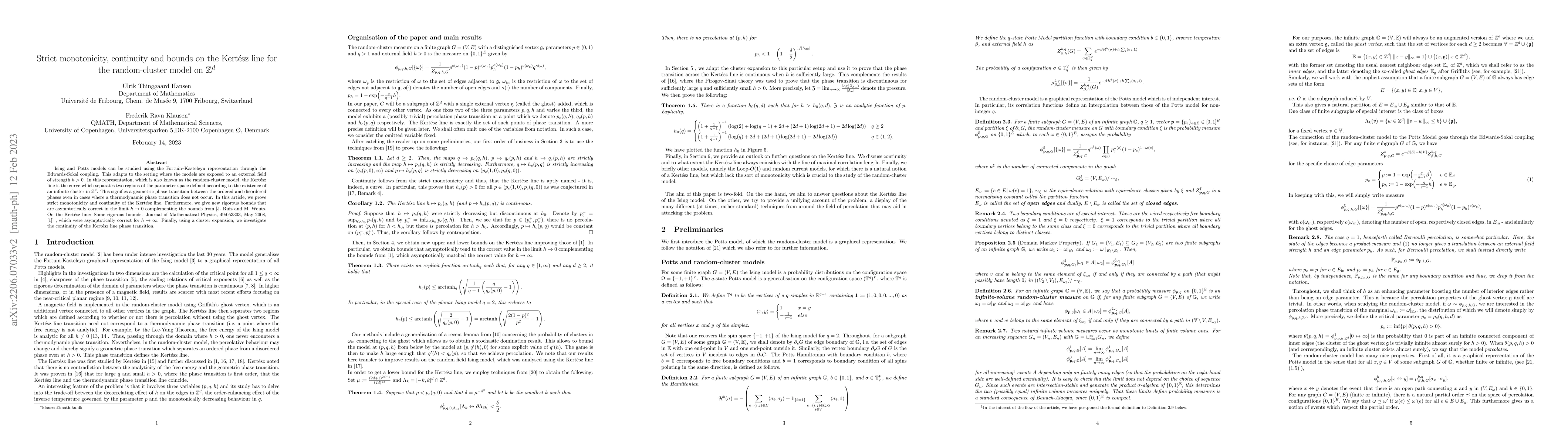 Ising and Potts models can be studied using the Fortuin-Kasteleyn representation through the Edwards-Sokal coupling. This adapts to the setting where the models are exposed to an external field of strength $h>0$. In this representation, which is also known as the random-cluster model, the Kert\'{e}sz line separates the two regions of parameter space according to the existence of an infinite cluster in $\mathbb{Z}^d$. This signifies a geometric phase transition between the ordered and disordered phases even in cases where a thermodynamic phase transition does not occur. In this article, we prove strict monotonicity and continuity of the Kert\'{e}sz line. Furthermore, we give new rigorous bounds that are asymptotically correct in the limit $h \to 0$ complementing the bounds from the work of Ruiz and Wouts [J. Math. Phys. 49, 053303 (2008)], which were asymptotically correct for $h \to \infty$. Finally, using a cluster expansion, we investigate the continuity of the Kert\'{e}sz line phase transition.
