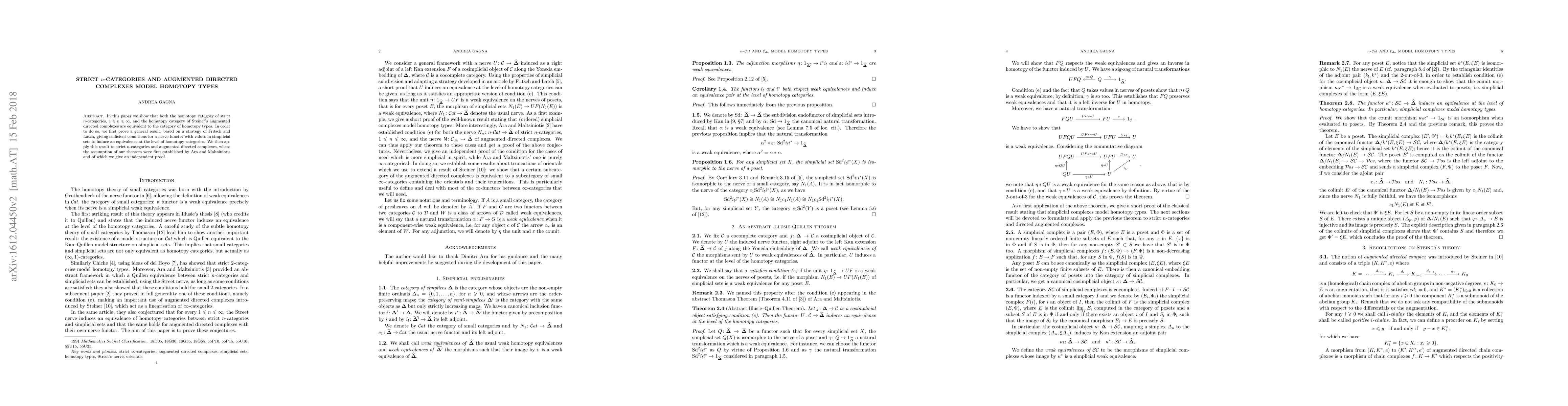 This paper demonstrates that the homotopy category of strict n-categories and that of Steiner's augmented directed complexes are equivalent to the category of homotopy types. It utilizes an abstract result from Fritsch and Latch, adapted to prove the equivalence via nerve functors and conditions established by Ara and Maltsiniotis.