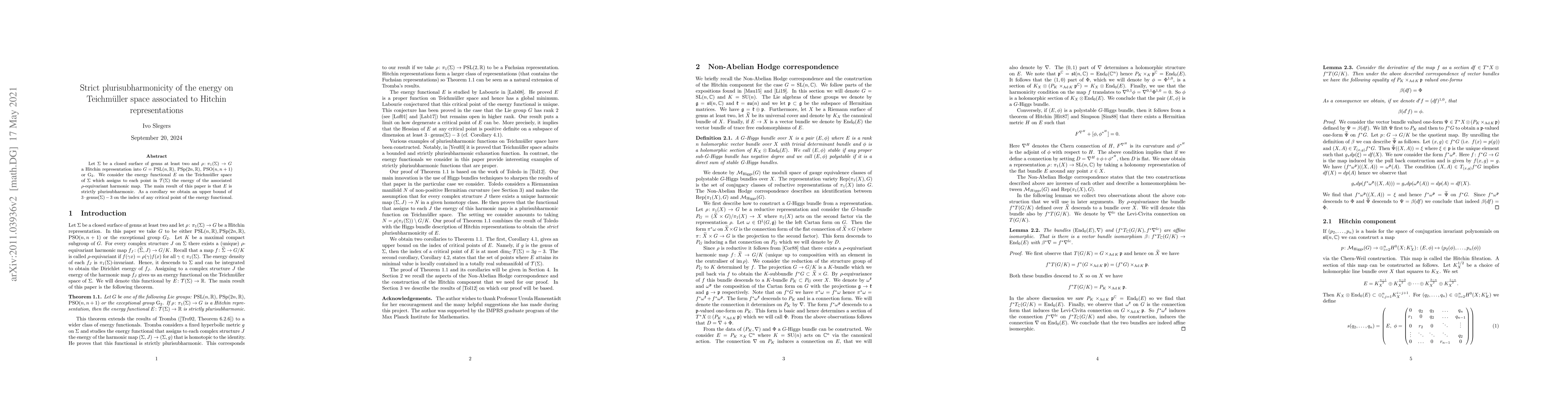 Let $\Sigma$ be a closed surface of genus least two and $\rho \colon \pi_1(\Sigma) \to G$ a Hitchin representation into $G=\text{PSL}(n,\mathbb{R})$, $\text{PSp}(2n,\mathbb{R})$, $\text{PSO}(n,n+1)$ or $\text{G}_2$. We consider the energy functional $E$ on the Teichm\"uller space of $\Sigma$ which assigns to each point in $\mathcal{T}(\Sigma)$ the energy of the associated $\rho$-equivariant harmonic map. The main result of this paper is that $E$ is strictly plurisubharmonic. As a corollary we obtain an upper bound of $3 \cdot \text{genus}(\Sigma) -3$ on the index of any critical point of the energy functional.